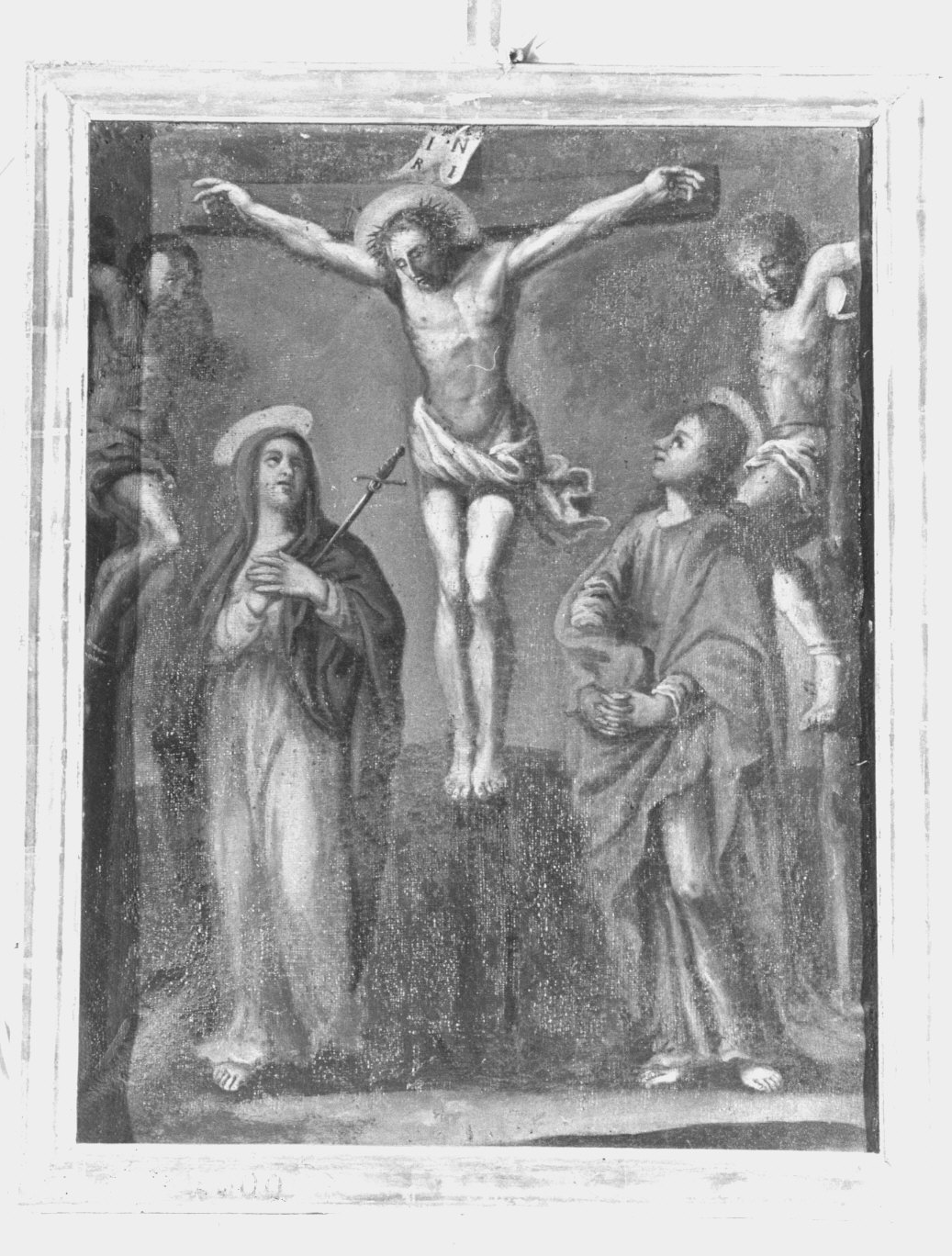 Crocifissione. Le 14 stazioni, con cornice in legno e croce in alto, rappresentano le altrettante scene consuete della via Crucis. Nella prima, raffigurante Gesù incororato e legato, condannato a morte nel pretorio di Pilato, c'è in basso il nome degli offerenti e l'anno. Le scene sono pefettamente aderenti al tema: caricato della, prima caduta, incontro con Maria, aiutanto dal Cireneo, asciugato dalla Veronica, seconda caduta ecc