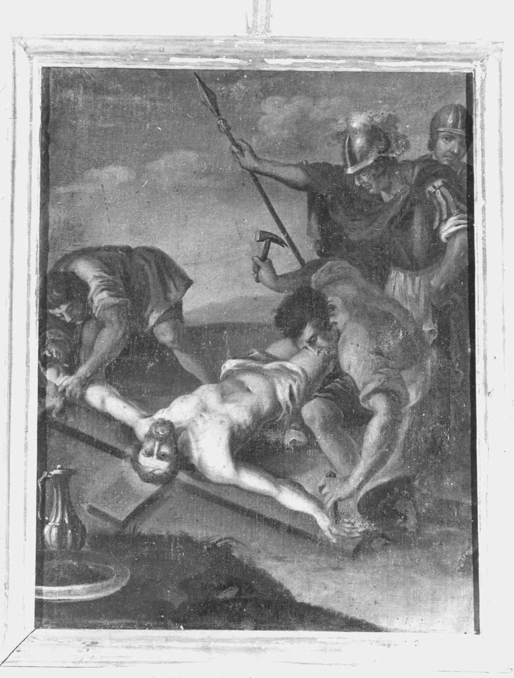 - NOTIZIE STORICO CRITICHE Come si legge nella prima stazione, la serie dei quadri è stata fornita o comunque eseguita a spese dei benefattori, cioè emigrati locali a Roma, che, com'era allora costume, riuniti in cassette o compagnie e confraternite, inviavano spesso opere in dono alle loro chiese di origine. Nell'Inventario statale del 1938 la serie delle tele della Via Crucis non è menzionata