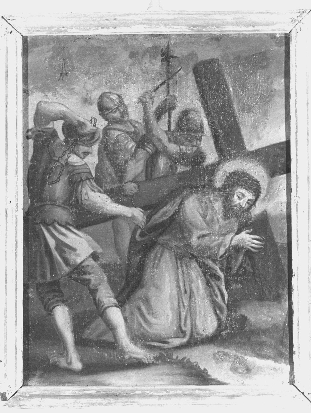 Cristo cade la prima volta. Le 14 stazioni, con cornice in legno e croce in alto, rappresentano le altrettante scene consuete della via Crucis. Nella prima, raffigurante Gesù incororato e legato, condannato a morte nel pretorio di Pilato, c'è in basso il nome degli offerenti e l'anno. Le scene sono pefettamente aderenti al tema: caricato della, prima caduta, incontro con Maria, aiutanto dal Cireneo, asciugato dalla Veronica, seconda caduta ecc