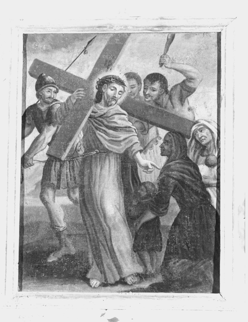 Cristo consola le pie donne di Gerusalemme. Le 14 stazioni, con cornice in legno e croce in alto, rappresentano le altrettante scene consuete della via Crucis. Nella prima, raffigurante Gesù incororato e legato, condannato a morte nel pretorio di Pilato, c'è in basso il nome degli offerenti e l'anno. Le scene sono pefettamente aderenti al tema: caricato della, prima caduta, incontro con Maria, aiutanto dal Cireneo, asciugato dalla Veronica, seconda caduta ecc