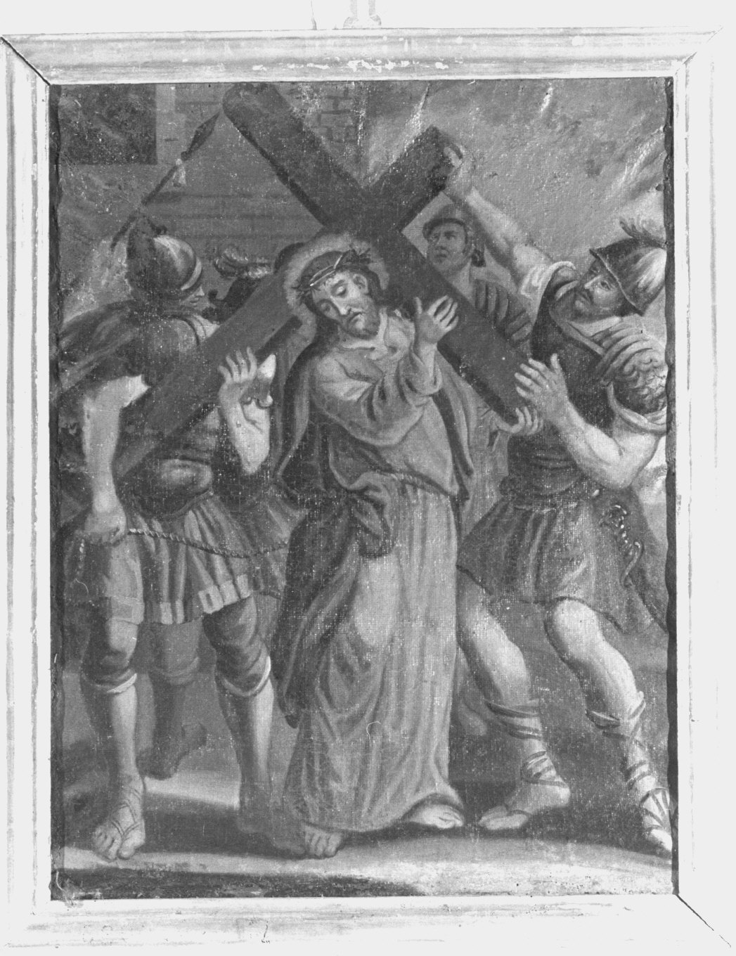 Gesù caricato della croce. Le 14 stazioni, con cornice in legno e croce in alto, rappresentano le altrettante scene consuete della via Crucis. Nella prima, raffigurante Gesù incororato e legato, condannato a morte nel pretorio di Pilato, c'è in basso il nome degli offerenti e l'anno. Le scene sono pefettamente aderenti al tema: caricato della, prima caduta, incontro con Maria, aiutanto dal Cireneo, asciugato dalla Veronica, seconda caduta ecc