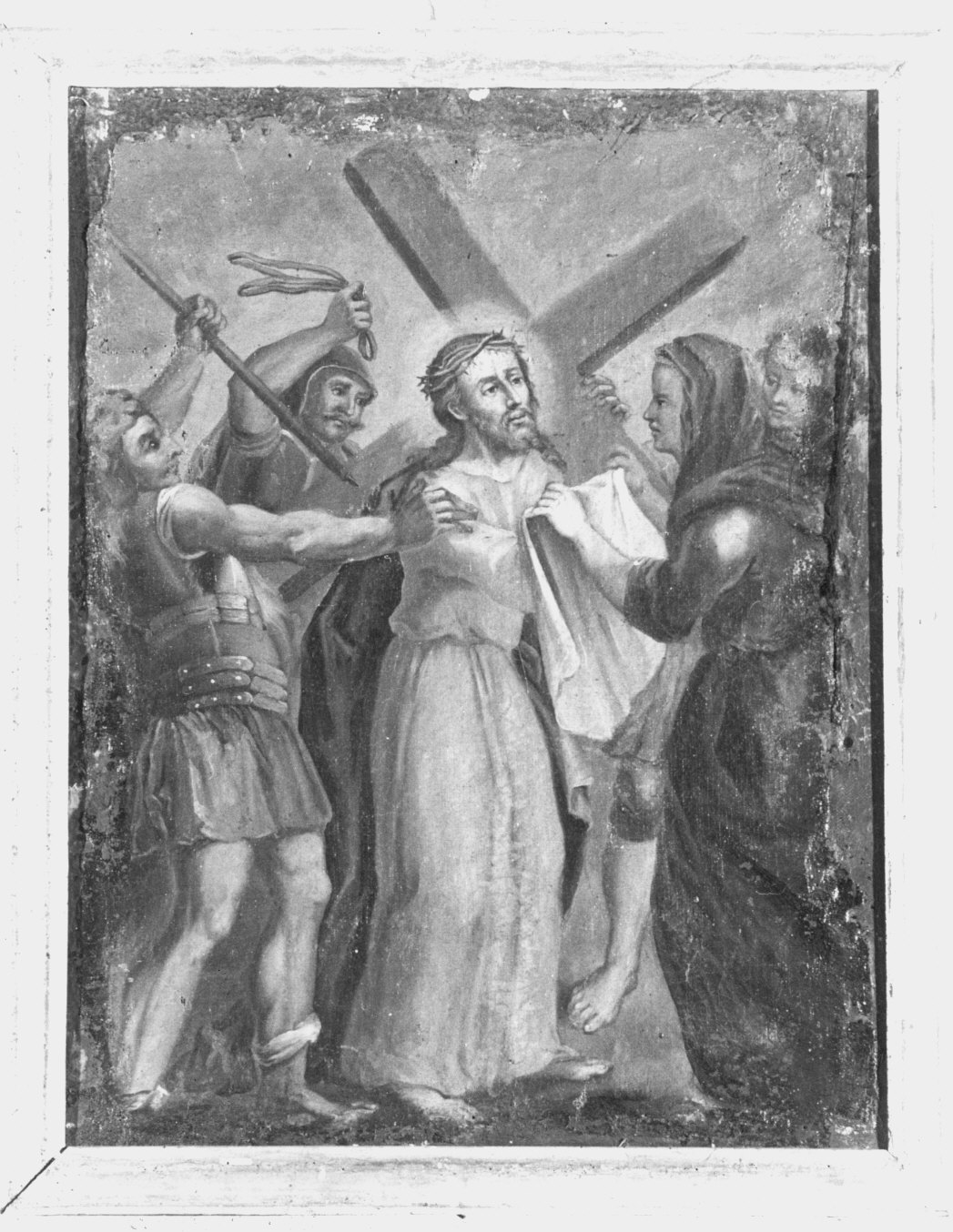 Gesù asciugato dalla Veronica. Le 14 stazioni, con cornice in legno e croce in alto, rappresentano le altrettante scene consuete della via Crucis. Nella prima, raffigurante Gesù incororato e legato, condannato a morte nel pretorio di Pilato, c'è in basso il nome degli offerenti e l'anno. Le scene sono pefettamente aderenti al tema: caricato della, prima caduta, incontro con Maria, aiutanto dal Cireneo, asciugato dalla Veronica, seconda caduta ecc