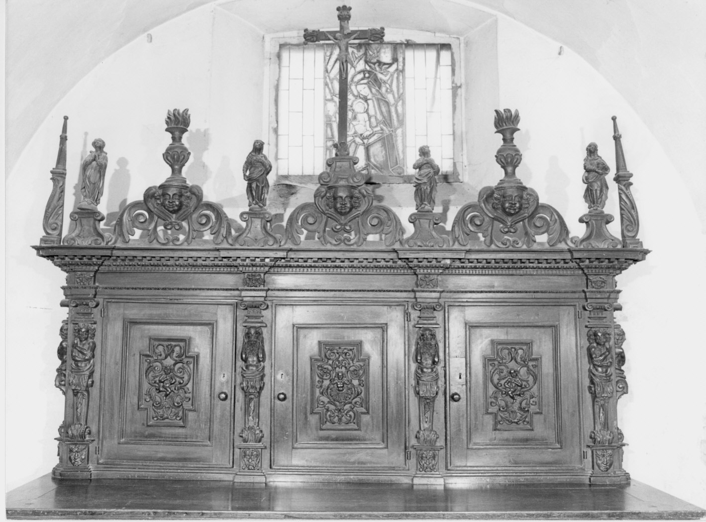 Parte superiore dell'armadio da sacrestia. Sia il corpo inferiore sia superiore sono a cinque pannelli, tre in facciata e due sui fianchi, separati da cariatidi con uomini barbuti, reggenti capitelli ionici. Nei pannelli inferiori volute, fogliami e rosoncini incorniciano in nicchia cinque santi (SS. Rocco, Gregorio, Giorgio, Stefano, Lorenzo); in quelli superiori vi sono fogliami, ornati floreali e puttini. La cimasa presenta tre acroteri con testine e volute fogliacee tra quattro statuine di sante (le Marie?) con al centro un alto crocifisso