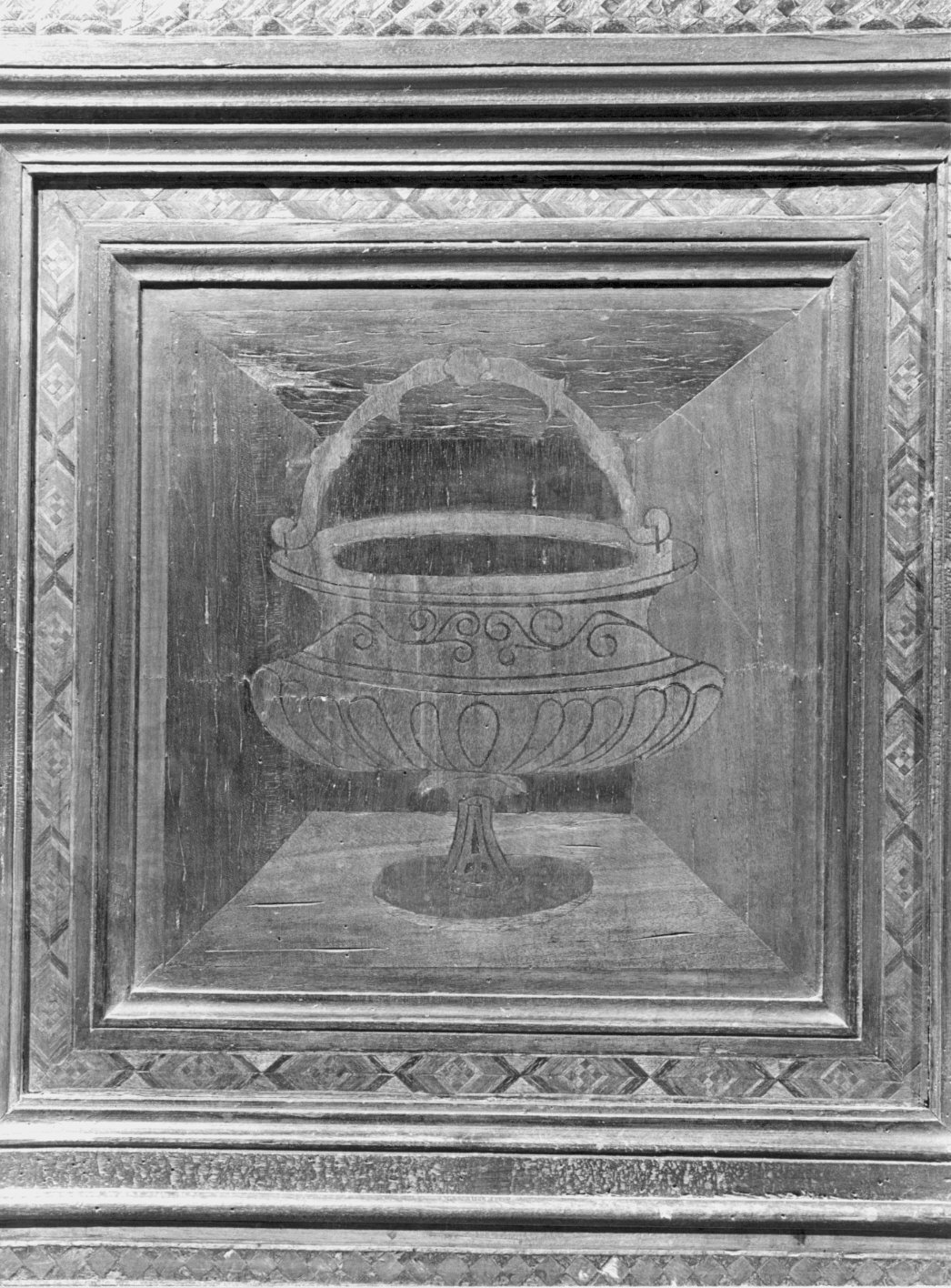 II dossale, diviso in quattro pannelli da pilastri compositi e corinzi, è ornato da intagli che presentano da sinistra: un cilindro con sopra frutti; un vaso baccellato; un calice con ostia a patena posta obliquamente; un vaso con frutti. I due pannelli sotto il sedile sono ornati da motivo centrale geometrico