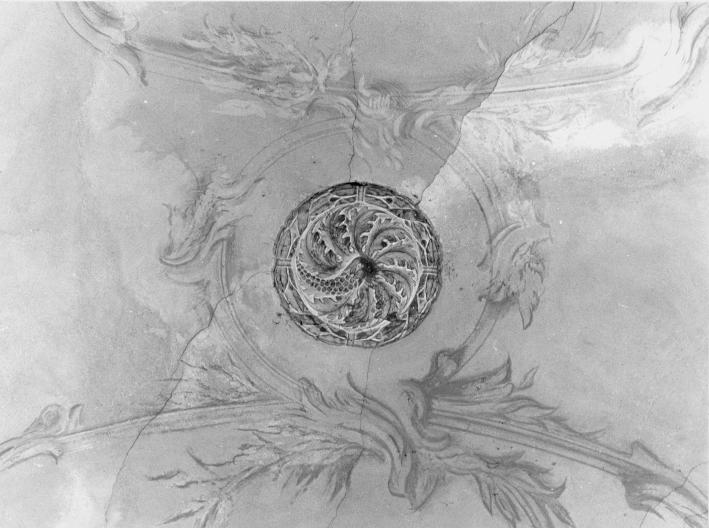 Dipinto murale con motivo vegetale- decorativo con al centro un tondo di marmo bianco. Il presbiterio presenta nella parte verso l'aula uns volta a botte interamente affrescata con architetture a colonne e trompe- l'oeuil, con vasi di fiori e festoni. Al centro, una rosa in tondo di marmo bianco. Il pentagono del coro è affrescato dallo stesso autore con tre aperture a lunetta, dalla cui estremità si diparte una decorazione a triangoli, culminante con balconata a semicerchio. Predomina la tinta grigio- verde. Nel monogramma di Cristo in marmo bianco, posto al centro della volta del coro, è scolpito a caratteri gotici: IHS