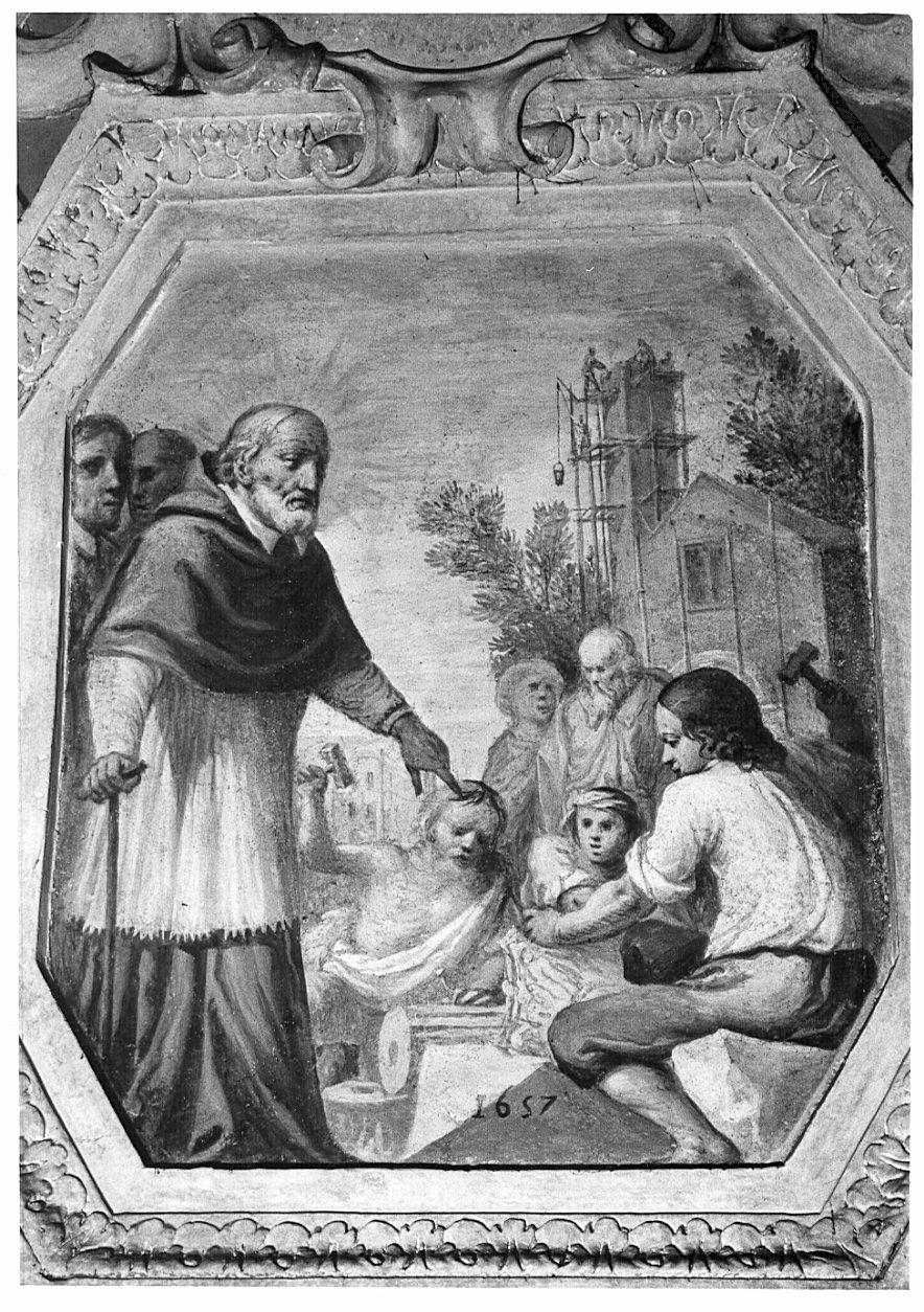 Ecclesiastici: prelato. Figure maschili: muratori. Costruzioni: chiesa. Oggetti: martelli