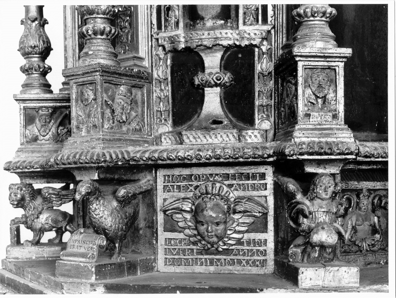 Simboli: evangelista Marco; evangelista Matteo; evangelista Luca; evangelista Giovanni. Decorazioni: motivi decorativi a mascheroni e figure grottesche