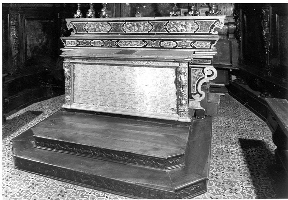 - NOTIZIE STORICO CRITICHE Il materiale impiegato per il dossale, nonchè il disegno e il partito decorativo, indicano un lavoro di carattere locale, di piacevole e semplificata ispirazione barocca. La discordanza di livello e di ricchezza decorativa fra il paliotto e la pedana, e il dossale stesso, fa pensare che quest'ultimo sia stato eseguito nel XVIII secolo