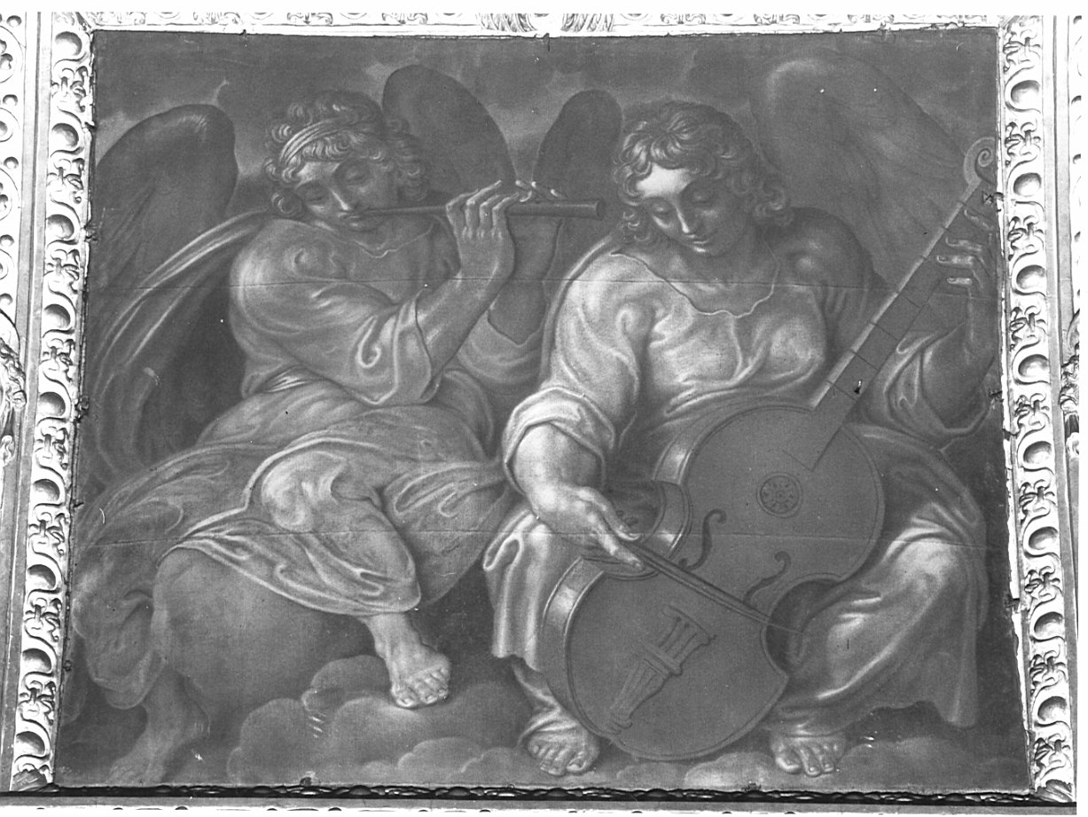 Figure: angeli musicanti. Fenomeni metereologici: nuvole. Strumenti musicali: flauto; violoncello