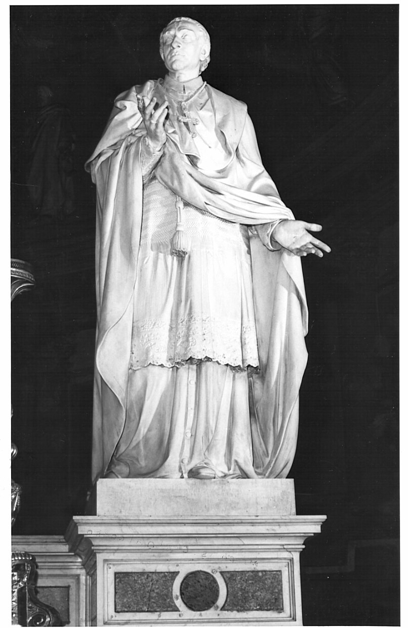 La grande statua è posta sul basamento laterale di destra dell'altare maggiore: a sinistra, un'altra, analoga, raffigura S. Ambrogio