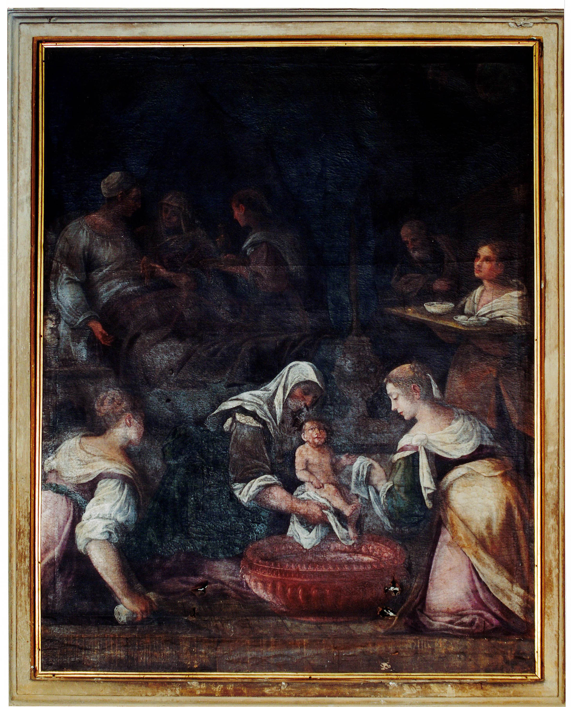 In primo piano a destra due ancelle immergono Maria bambina in una conca rossa; a sinistra è una terza ancella con pannolini. In secondo piano a sinistra è Anna, in camicia da note bianca, a letto, assistita da due ancelle; a destra Gioacchino e una ancella che porta un vassoio con due scodelle
