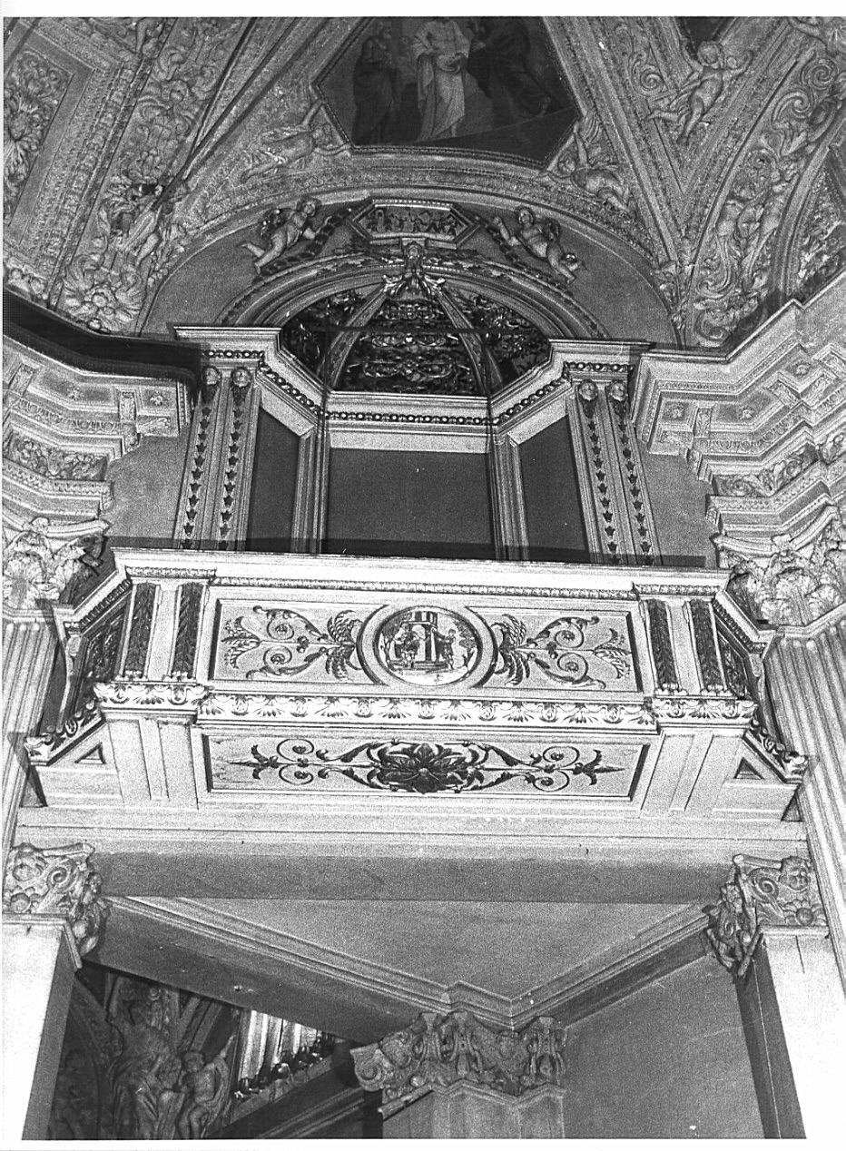 Cantoria costituita da: parapetto rettangolare ad angoli smussati, ornato di motivi racemici a rilievo, dorati, entro campiture bianche con modanature dorate