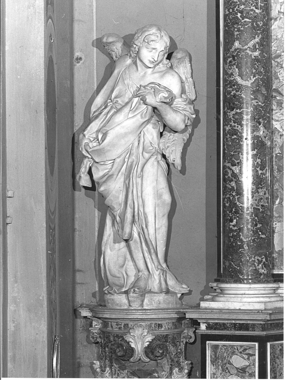 Angelo eretto, giovane, con capelli fluenti, avvolto in un amplissimo manto che gli lascia scoperta la spalla sinistra. L'atteggiamento di meditazione dolorosa lascia supporre che esso (come il suo pendant) sia in connessione con il tema dell'altare, il Compianto su Cristo morto. Poggia su una base in marmi vari, affine nello stile all'altare di cui costituisce come la continuazione