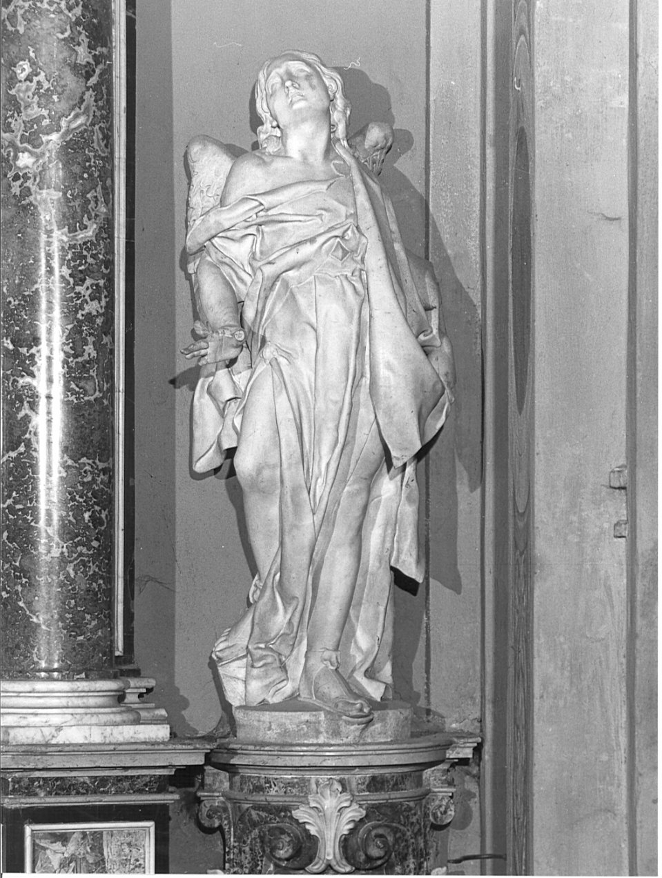 Angelo eretto, giovane, con pronunciati caratteri femminili, avvolto in un ampio manto che lascia scoperta la spalla sinistra. leva il volto in alto, e apre le braccia in atto di contemplazione adorante: per la connessione con il tema dell'altare. Poggia su una base in marmi vari, affine nello stile all'altare di cui costituisce come la continuazione