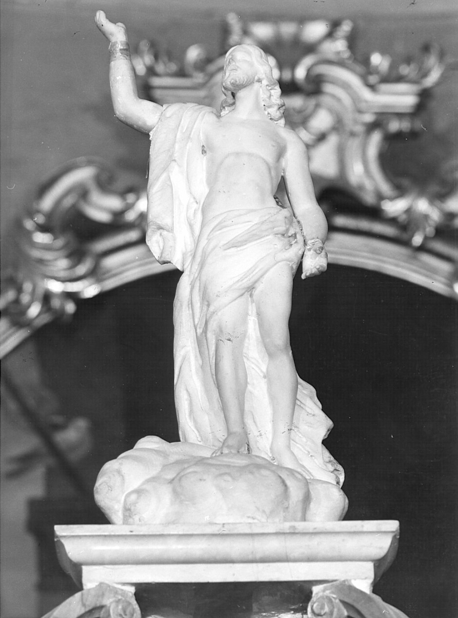 In cima alla tribuna statuetta raffigurante Cristo Risorto, di marmo bianco. Il Cristo si eleva su di una nuvola; tiene la mano destra alzata