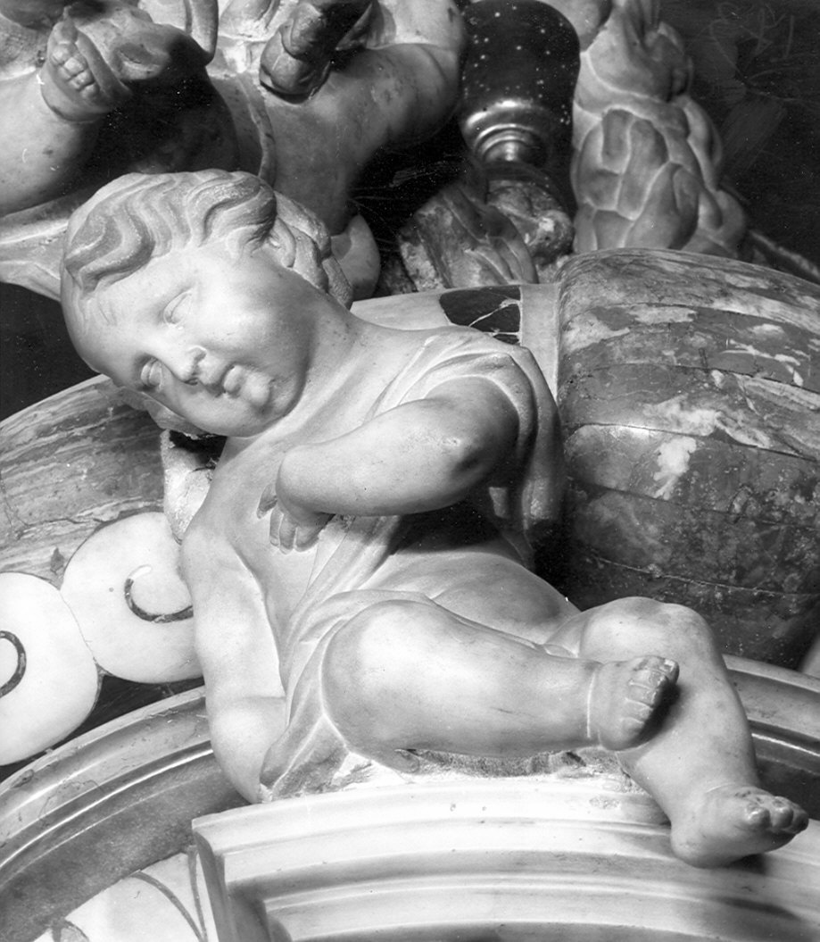- NOTIZIE STORICO CRITICHE Da documenti originali nell'Archivio parrocchiale di Clusone e dell'Archivio Fantoni di Rovetta si hanno notizie che nel 1700 venne costruita dalla bottega dei Fantoni la mensa dell'altare, nel 1702 alcune figure, il paliotto, due angeli e la statuaria della mensa; nel 1705, 4 gennaio, esiste una nota per le statue di marmo del tabernacolo su commissione di Maddalena Viti (di questo esiste a Rovetta il disegno e il contratto di esecuzione). I lavori di quadratura dell'altare sono opera di Domenico Corbelli da Brescia. Infine nel 1711 Maddalena Viti spede duemila ottocento lire "perchè si adorni il tabernacolo e la tribuna dell'altare maggiore della nostra parrocchiale" delle statue fantoniane. L'opera compare nel regesto del catalogo della mostra sui Fantoni (in preparazione, a cura di G. Ferri Piccaluga, M. Lorandi), conservato presso l'Archivio Fantoni di Rovetta