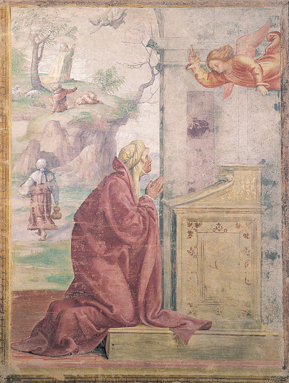 Annunciazione a Sant'Anna, sullo sfondo San Gioacchino e l'Angelo. annuncio della nascita di Maria Vergine a Sant'Anna// annuncio della nascita di Maria Vergine a San Gioacchino