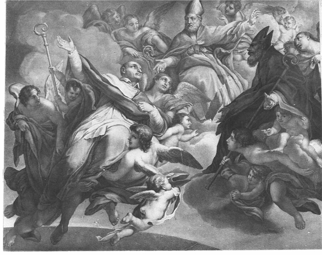 Personaggi: San Carlo Borromeo; Sant'Ambrogio; San Barnaba. Figure: angeli; cherubini. Fenomeni metereologici: nuvole