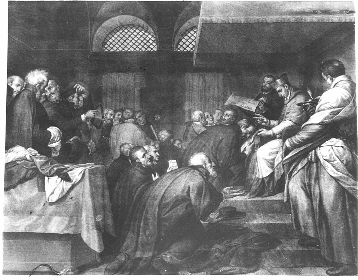 Personaggi: San Carlo Borromeo; prelati. Interno. Oggetti. Mobilia
