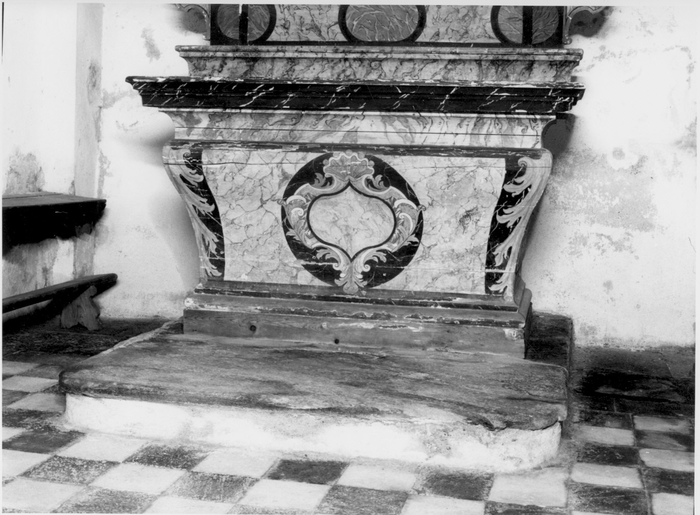 Paliotto solidale dipinto a finto marmo con tondo centrale nero e targa attorniata da volute, ornati vegetali e conchiglia sulla sommità; lungo fianchi foglia d'acanto