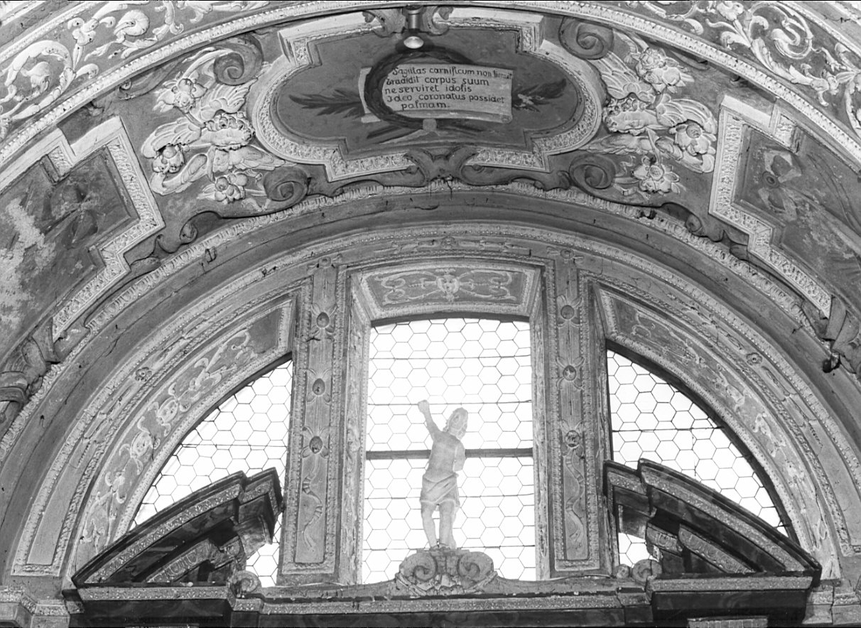 - NOTIZIE STORICO CRITICHE Ancona attribuibile agli stessi stuccatori che operarono nella cappella. Tale ancona risulta, pur nella novità dell'uso dello stucco e della soluzione degli angeli laterali, di ascendenza chiaramente seicentescasecondo la tradizione, soprattutto visibile nel particolare di Cristo risorto collocato alla sommità dell'ancona