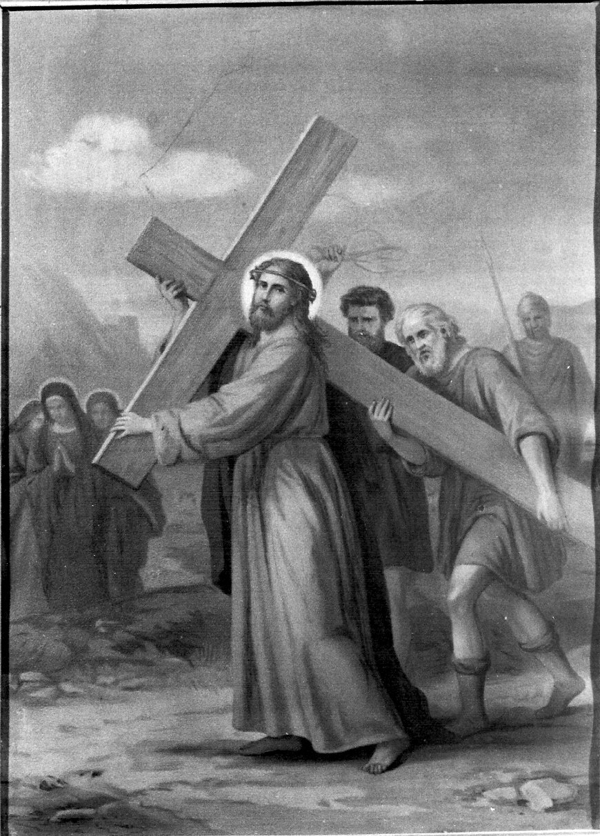 Personaggi: Cristo ; Simone il Cireneo. Figure maschili: soldato. Oggetti: croce ; flagello. Armi: lancia. Paesaggi: paesaggio collinare
