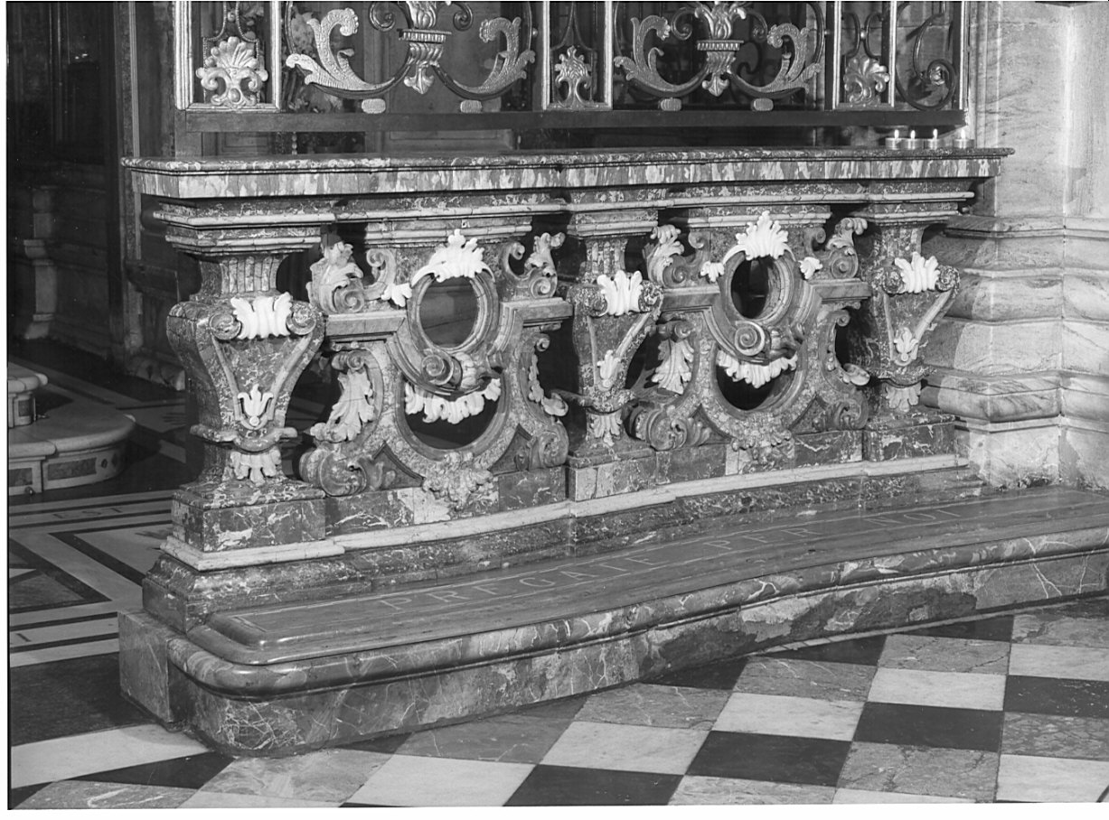 Base a sezione trapezoidale percorsa da modanatura in marmo giallo. Balaustri a vaso con specchiature sagomate decorate con foglie d'acanto e ciondoli. Specchiature a traforo di forma sagomata con ovale centrale anch'essi arricchiti di foglie d'acanto