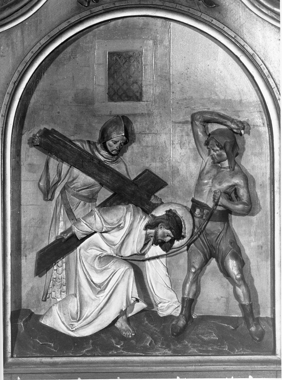 Personaggi: Cristo. Figure: carnefice; soldato. Oggetti: croce; corda. Architetture