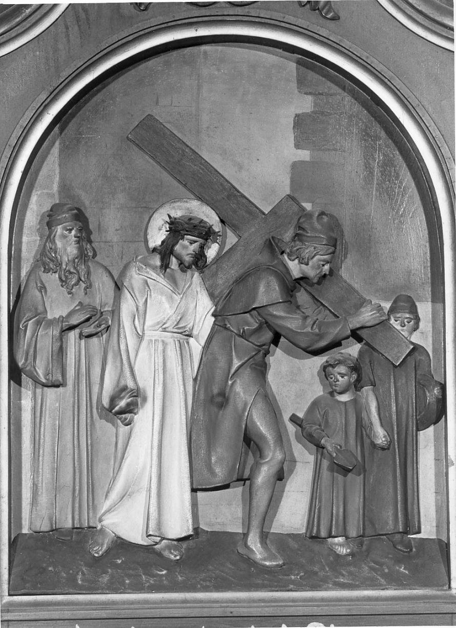 Personaggi: Cristo; Cireneo. Figure: bambini; vecchio. Oggetti: croce; palmetta; piatto. Architetture