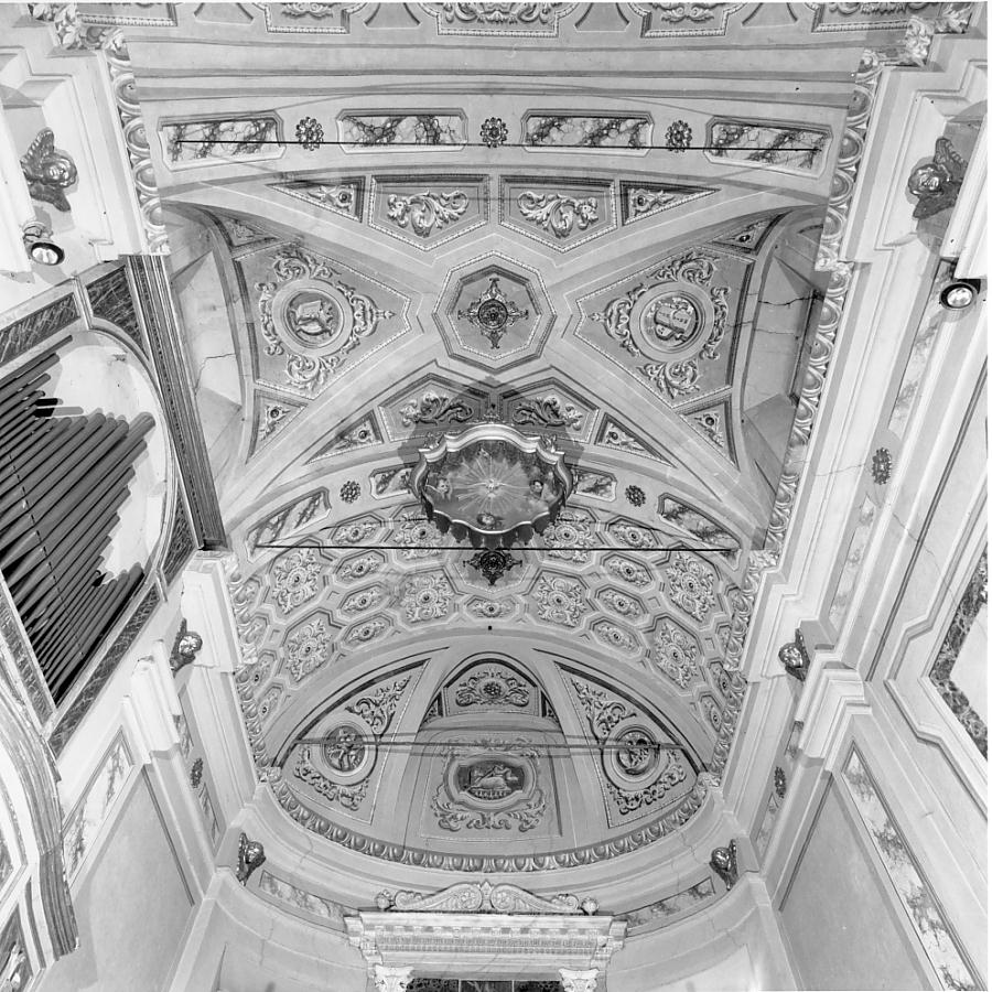Decorazioni: Finti marmi; a ovuli; a cassettoni con rosette. Personaggi: angeli. Simboli: calice; tavole dellla legge; pellicano; agnello mistico. Simboli della passione
