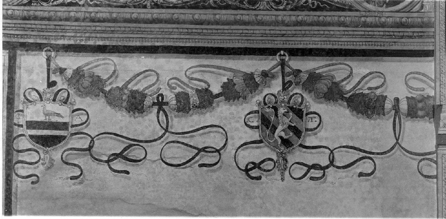 - STEMMI parete sinistra - gentilizio - Stemma - Bipartito con fasce orizzontali nella parte inferiore e colomba in quella superiore