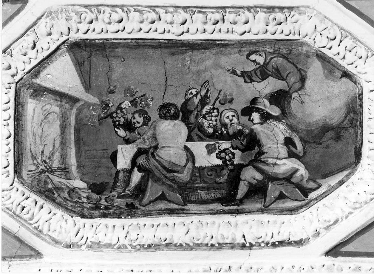 Personaggi: Sant'Antonio da Padova; uomini. Oggetti: tavolo; sgabelli; camino; fuoco. Frutti: grappoli d'uva
