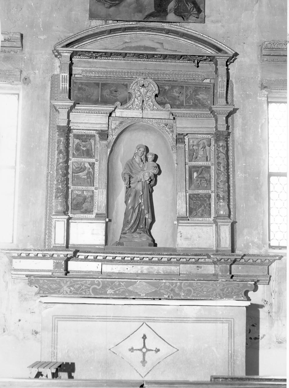 - NOTIZIE STORICO CRITICHE L'ancona è costituita da elementi appartenenti, con ogni probabilità, all'altare menzionato in alcuni documenti del 1606 come opera affidata al "Viani intagliatore", forse Pompilio, uno dei figli di Giambattista Viani, fratello del ben più noto Antonio Maria Viani, del quale era stata peraltro richiesta l'assistenza. La realizzazione dell'ancona fu commissionata dalla locale Compagnia del Rosario. Non è dato di sapere quando sia avvenuta la scomposizione del complesso originario e la sua ricomposizione, attuata in modo assai incongruente e arbitrario. L'ancona copre lo spazio di un precedente complesso ornamentale di cui s'intravedono, ai lati, treccioni decorativi in stucco