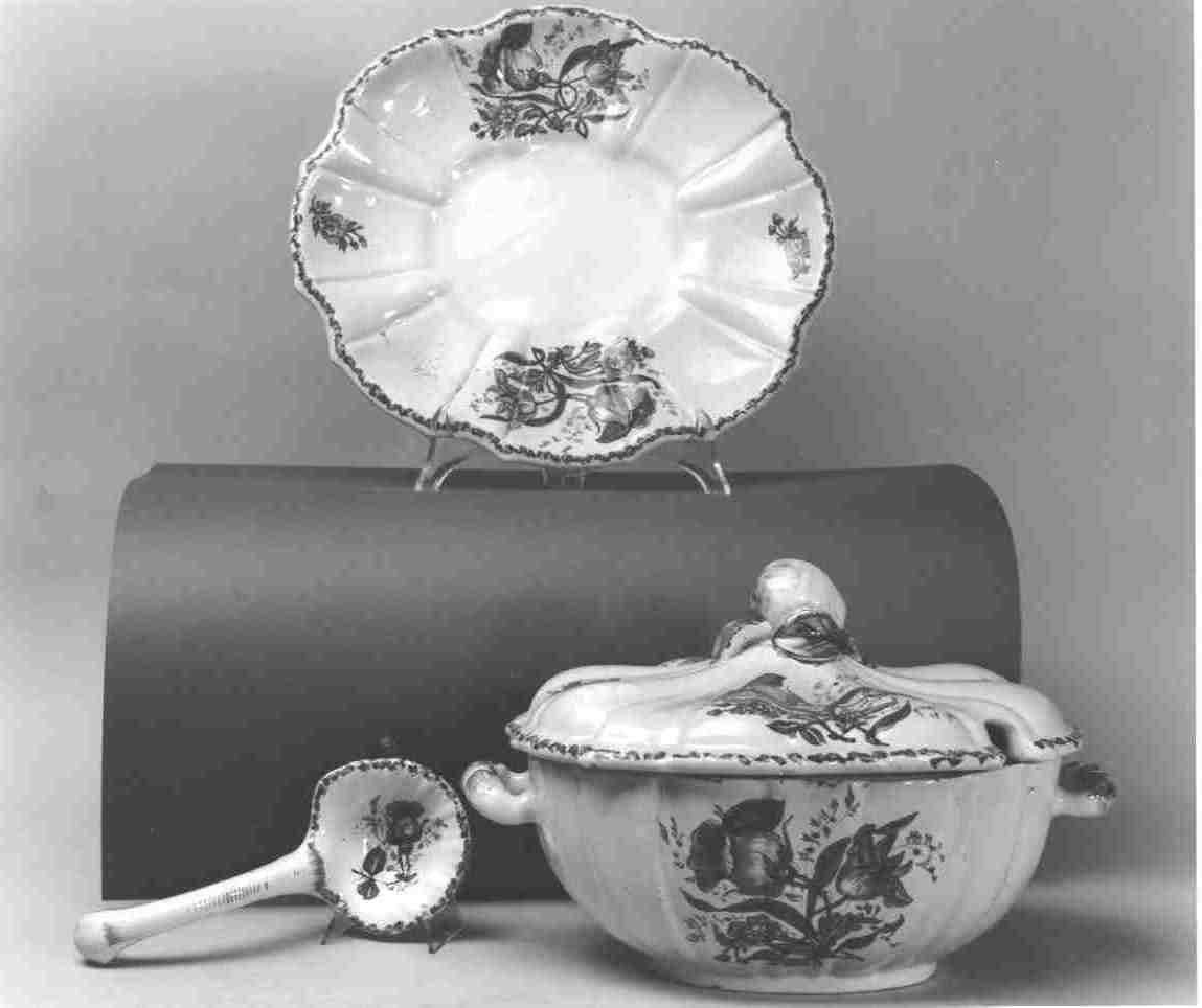 zuppiera con piatto e mestolino, decorati con mazzetti di fiori e foglie. La zuppiera ha forma ovoidale, come il piatto, ed è percorsa da baccellature e scanalature, i manici e l'impugnatura del coperchio sono elementi fitomorfi. Il mestolo ha forma a conchiglia