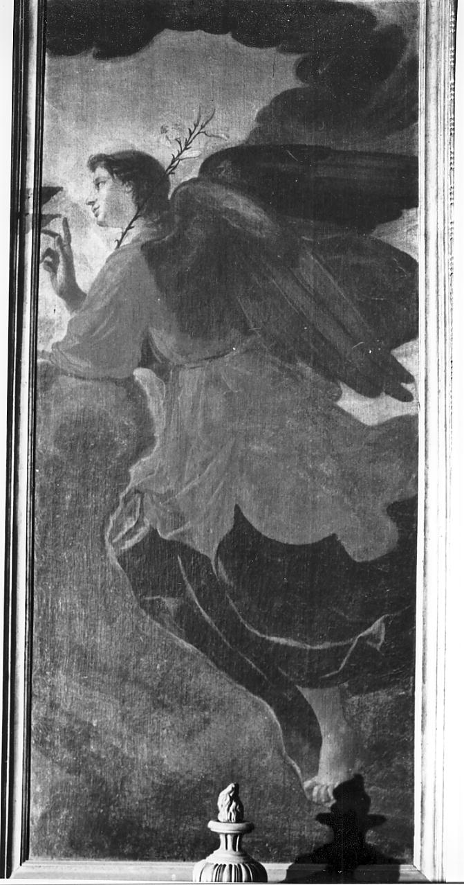 Personaggi: angelo Gabriele. Attributi: (angelo) annunciante; panneggiato; sospeso nel suo protendersi secondo una leggera diagonale verso la Madonna; ha in mano il ramo del giglio di chiaro significato simbolico e tipico simbolo mariano