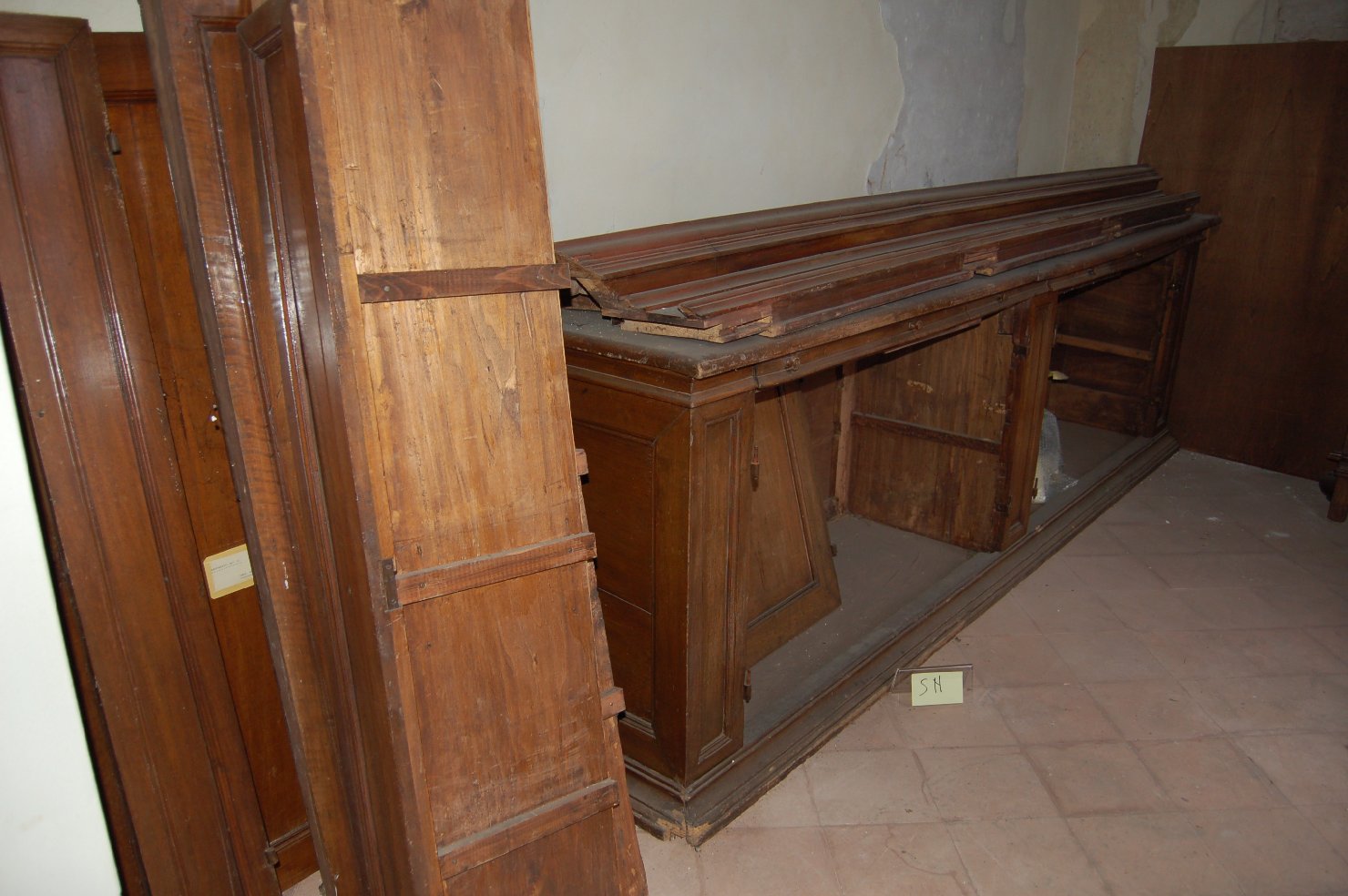 Armadio in legno di noce oggi interamente smontato con corpo superiore rip artito in tre parti comprendenti ante con specchiature rientranti e corni c i modanate, separate da lesene contraddistinte anche queste da strette s pe cchiature più alte. Cornice superiore modanata ed aggettante. Parte inf eri ore con quattro cassetti dotati di pomelli, posti nella cornice modan ata superiore. Il bancone è dotato di quattro ante con specchiature rient rant i e cornici modanate. Anche i fianchi sia del corpo inferiore che di quell o superiore, sono percorsi da specchiature. Base a cornice modanata contin ua