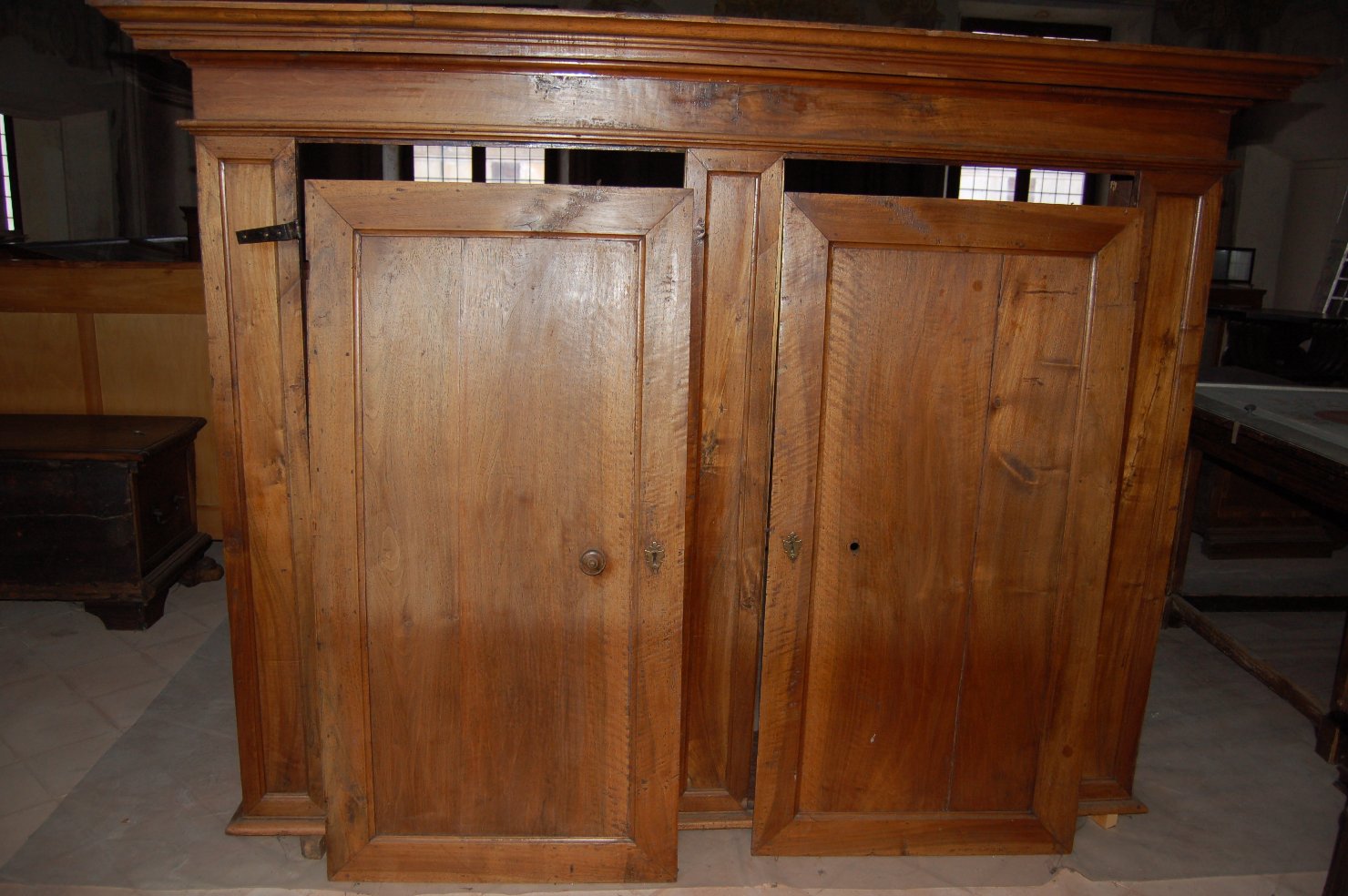 Armadio in legno di noce attualmente completamente smontato. E' costituito da due corpi sovrapposti. La parte superiore si compone di due ante spec chiate con serrature contornate da toppe metalliche e pomelli in legno (m a ncante quello di destra), alternate a lesene, anche queste con specchiat ur e più alte e ben più strettedi quelle delle ante. La cornice superiore ag gettante è modanata con fascia e cornice più ridotta sottostante. Il c orpo inferiore ripropone lo stesso schema compositivo della parte superior e, a nche se con un'altezza inferiore. Basamento a cornice modanata