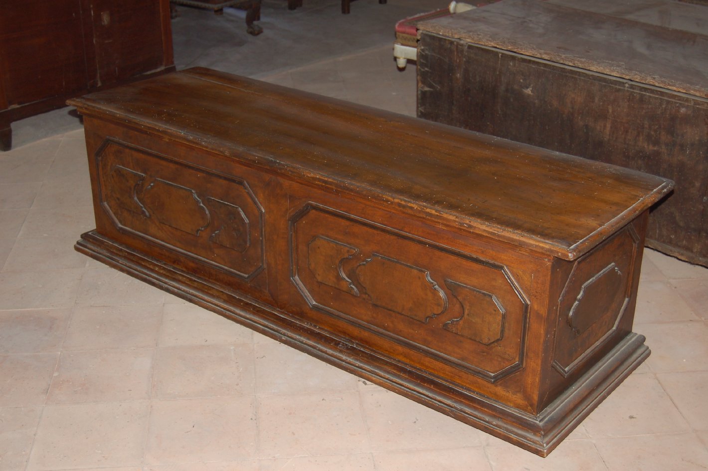- NOTIZIE STORICO CRITICHE Per i decori delle formelle mistilinee dei fronti, del tutto simili a quelli che ornano le tipologie di altri mobili (cassettoni, credenze, ecc.), il cassone può essere riferito al sec. XVII, probabilmente alla seconda metà. La cassa è registrata nell'inventario statale ed è descritta come "cassapanca in noce". E' entrata in Palazzo Ducale nel 1959 acquistata dalla signora Maria Fontana Canetrali di Luzzara