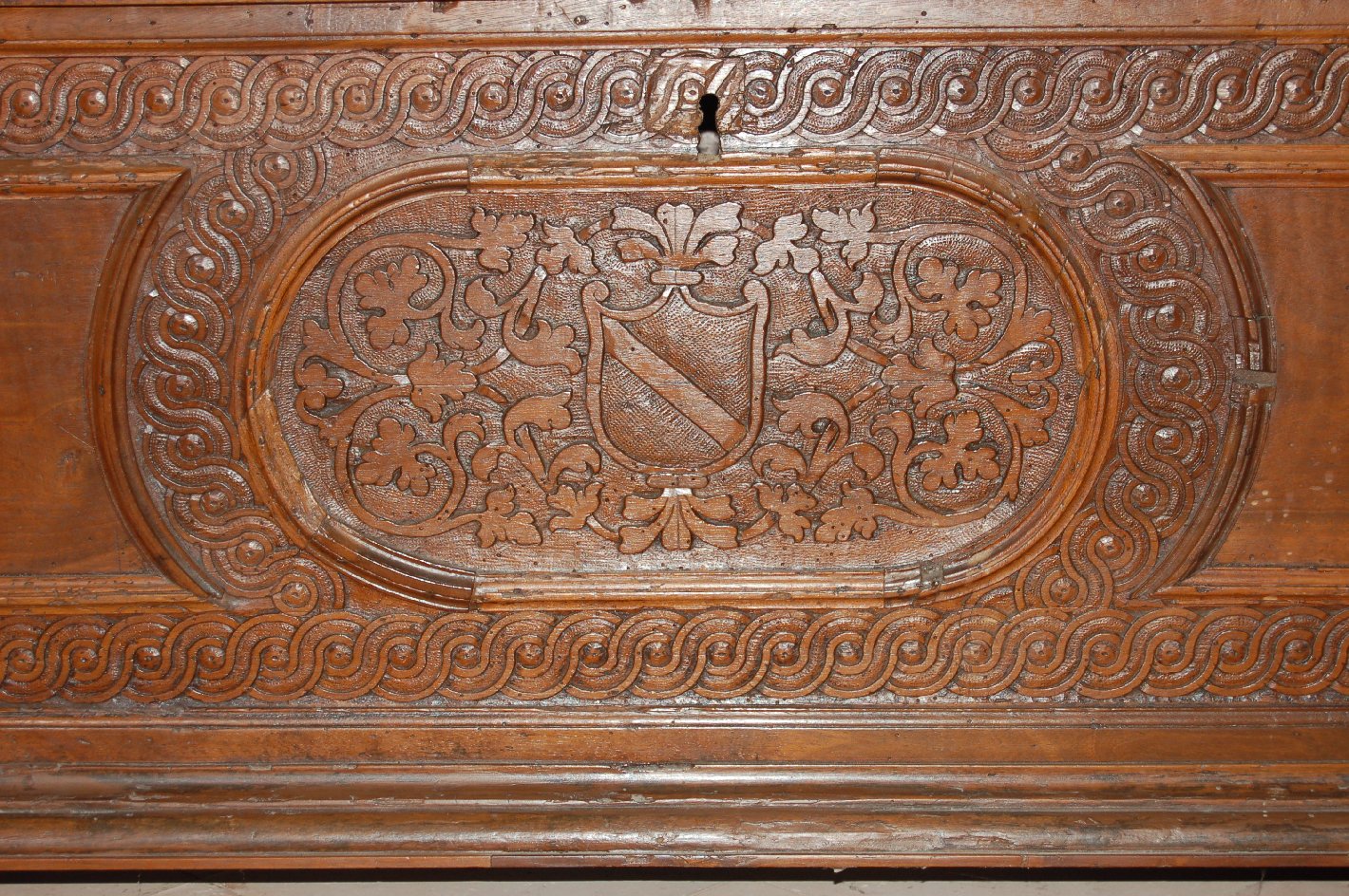 - NOTIZIE STORICO CRITICHE La funzione dotale del cassone è marcata dalo stemma famigliare al centro della specchiatura sul fronte. Il mobile dovrebbe ancora rientrare nella produzione cinquecentesca per gli evidenti richiami alle tipologie ornamentali più tipiche della tradizione rinascimentale; si consideri, in particolare, la treccia di raffinata fattura, di lontana matrice mantegnesca, che fa da cornice al fronte. Il cassone, registrato nel 1955 nell'inventario statale, viene descritto come un'opera veneta del sec. XVI. La mancanza di ulteriori indicazioni documentarie impedisce di fornire, per il momento, altre notizie sulla provenienza