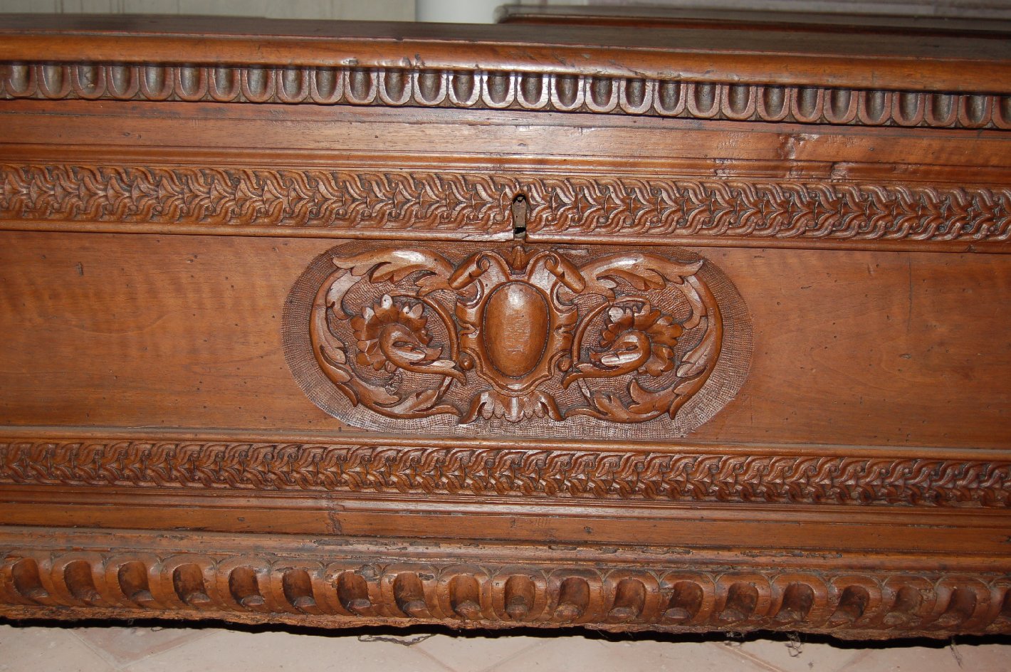 Cassone con piano aggettante e a becco d'oca, mantovana (ossia la cornice che corre sotto il coperchio) decorata con motivi intagliati a "unghia". Il fronte è occupato da una specchiatura delimitata da una cornice a doppio intreccio. Il centro è occupato da un incavo ellissoidale con fondo puntinato con ovato contornato da cartoccio da cui si dipartono due girali conclusi da elementi floreali. Alle estremità profili aggettanti e decorati con motivo a foglia d'acanto. Il basamento presenta una cornice in forte aggetto con baccellature concave. I piedi sono a zampa di leone