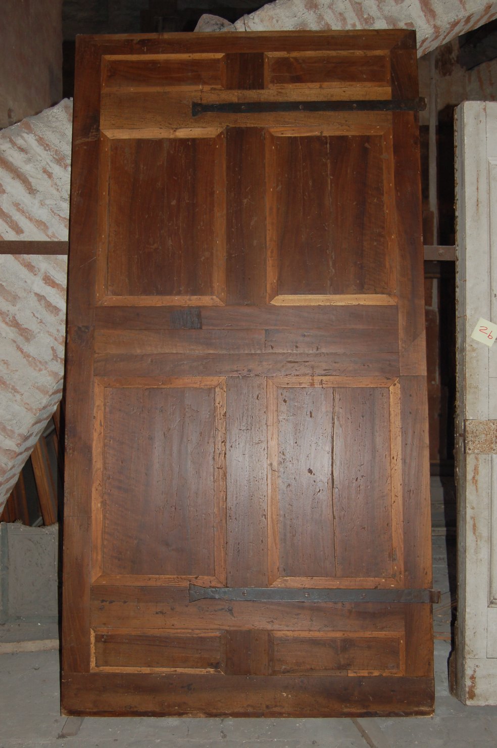 Porta ad un battente con il fronte principale suddiviso in quattro grandi specchiature rettangolari verticali con larghe cornici fittamente modanate, alternate ad altre sei più strette disposte in senso orizzontale e decorate da rilievi a "bugnato". L'altro fronte della porta presenta una superficie del tutto liscia, con decorazioni ad intarsio che ripropongono la suddivisione geometrica in specchiature del fronte; questo lato è pure percorso da due lunghe cerniere a barra. Del tutto assente il sistema di serratura