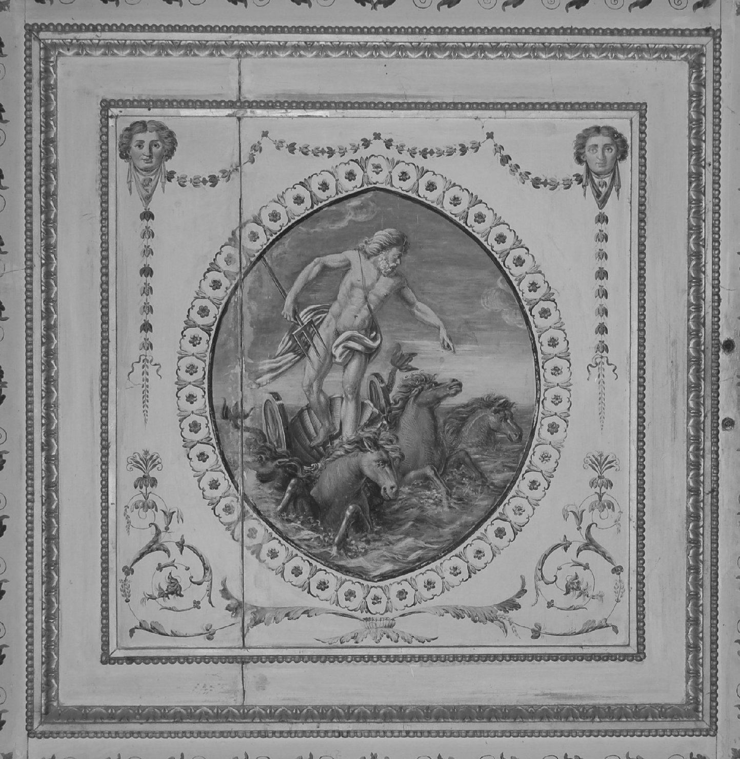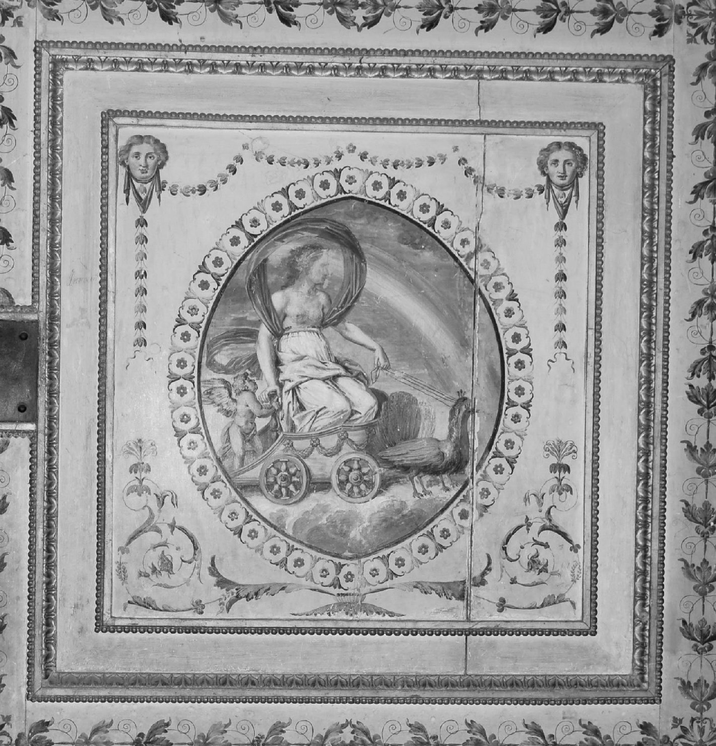 - NOTIZIE STORICO CRITICHE La porta è collocata tra la prima stanza dell'Appartamento degli Arazzi e la sala dei Papi ed è parte di una serie di cinque porte (NCTN 00151506, 507, 509, 511, 512) che mettono in comunicazione le varie stanze dello stesso appartamento. L'appartamento degli Arazzi, che si trova al piano superiore dei palazzetti tardogotici che collegandosi alla Magna Domus creano il cortile di Santa Croce. Tra il 1576 e il 1582 il duca Guglielmo lo riadattò a propria residenza ampliandolo; dopo di lui fu riservato alle duchesse ed ebbe l'appellativo di Madama. Nella seconda metà del Settecento, quando era noto come appartamento Verde, fu restaurato e modificato con la creazione delle stanze degli Arazzi e dell'Imperatrice. Le stanze degli Arazzi sono tre, già dette delle Imperatrici, del Leone e dell'Aquila, adattate a fine Settecento a contenere la serie di nove arazzi raffaelleschi detta degli Atti degli Apostoli. A seguire si trova la camera dello Zodiaco che conserva ancora la volta a padiglione dipinta nel 1579 da Lorenzo Costa il Giovane per Guglielmo Gonzaga. Vi è raffigurato il Carro di Diana trainato da cani tra le costellazioni del cielo (nel Cinquecento la camera era detta dei cani). Nel corso del Settecento, l'appartamento e tutto il Palazzo versava in condizioni di abbandono tale da giustificarne un grosso intervento di restauro, al fine di destinarne l'uso a residenza prima del governatore asburgico e poi dei rappresentanti del regime napoleonico. A partire dal 1772 è presente a Mantova l'arciduca Ferdinando d'Asburgo, in qualità di governatore. Per lui e per la moglie Beatrice d'Este vanno ristrutturate le stanze per consentire un'adeguata permanenza a Mantova; responsabile dei lavori è nominato l'architetto Paolo Pozzo. Il Pozzo si avvale dell'opera dei suoi allievi, tra cui primeggia per gli ornati Giambattista Marconi, e lo stuccatore ticinese Stanislao Somazzi. Si fa risalire al Pozzo il progetto della delicata decorazione delle porte ornate dell'appartamento "massime nello specchio di mezzo, di simboliche figure, contornate parte di corone di fiori, parte da una catena di nastri vario-colorite". La raffinatezza dell'insieme è sottolineata dal delicato contrasto tra lo sfondo bianco e i colori teneri delle raffigurazioni che temperano la loro radice arcadica con nitida compostezza. A queste pitture si accompagnano con calibrata armonia gli ornati a monocromo - cammei, candelabre, girali vegetali e meandri - che simulano bassorilievi. Esecutore del progetto di Paolo Pozzo è il Marconi, che come sottolinea il Pacchioni: "fece gli ornati a tempera dei soffitti, delle porte, delle lesene, dei basamenti"