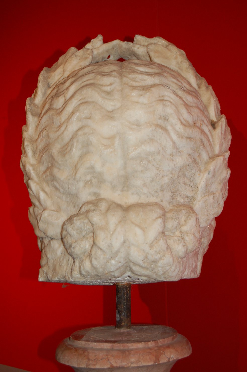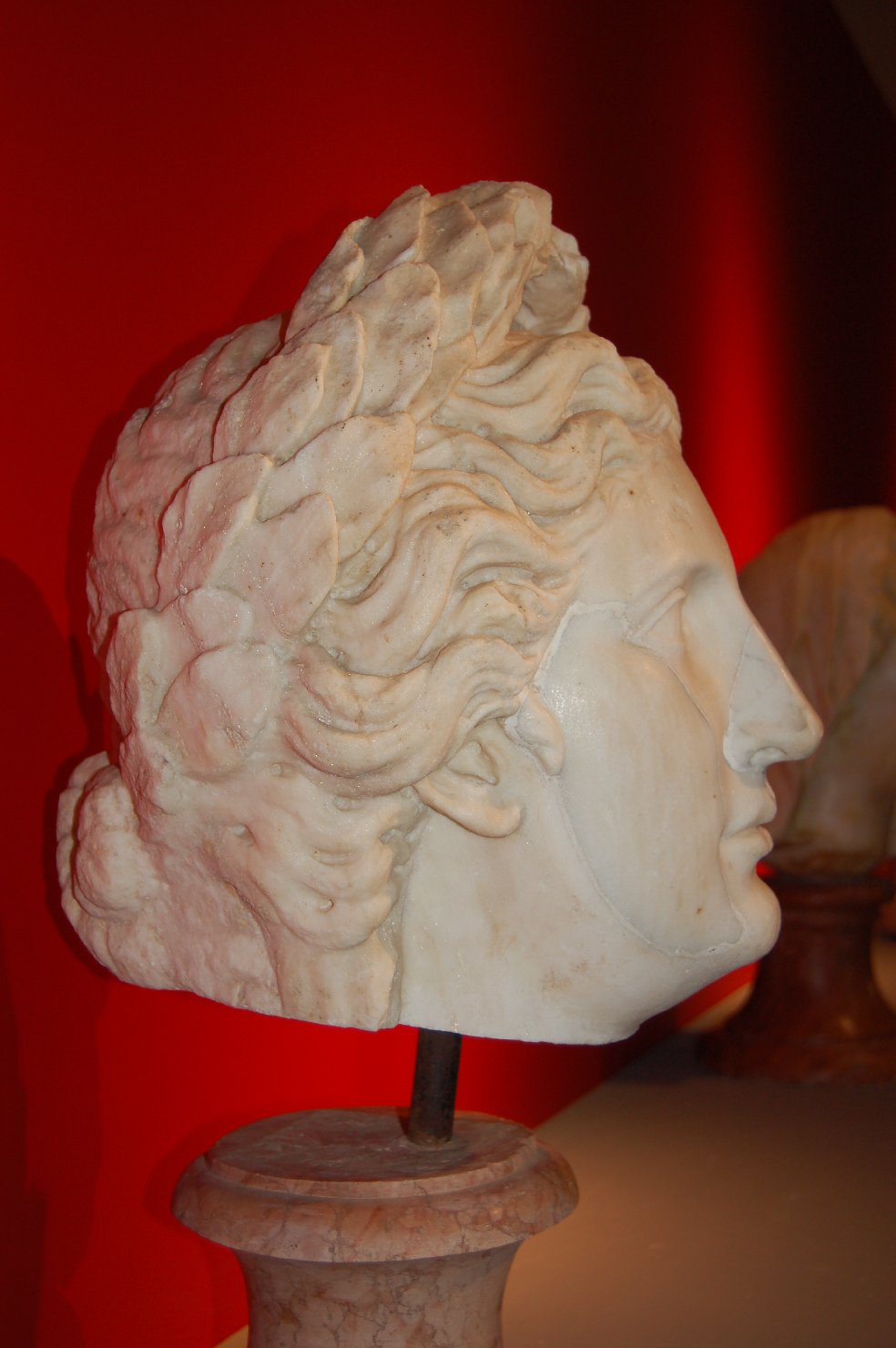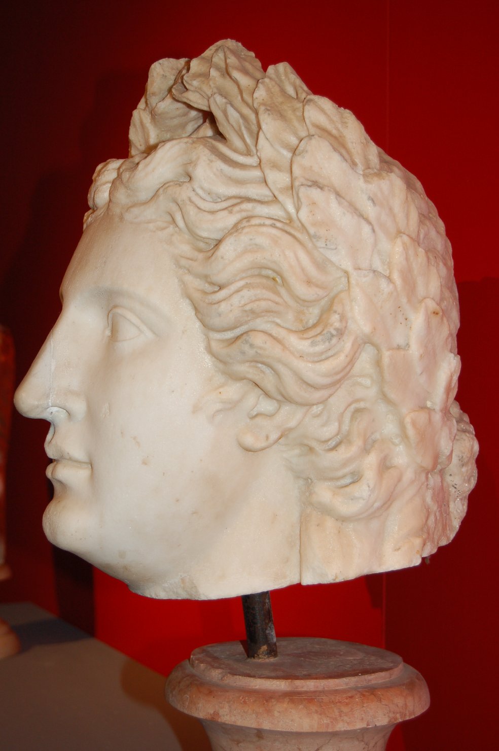 - NOTIZIE STORICO CRITICHE Testa di Apollo dal volto pieno, di tipo classico, con larghi occhi e bocca carnosa. La capigliatura, scriminata, consta di larghe onde, con sottosquadri a trapezio, portata all'indietro e raccolta in un nodo sulla nuca. Una corona di alloro cinge la testa e contrassegna la divinità. E' dubbio se appartenesse a una statua o fosse opera isolata. E' stata giudicata copia da originale greco, forse della cerchia di Agorakritos (V sec. a.C.) ma l'esecuzione, pur rispettando forme classiche, è piuttosto scialba. La lavorazione della capigliatura riporta ad età antoniana (seconda metà del II secolo dopo Cristo), ma manca la tipica lavorazione delle pupille. Si trovava a Palazzo Te, inserita sula statua di Musa (inv. ge. n. 6681). Forse al Museo dell'Accademia nel tardo Settecento e trasferita con questo al Palazzo degli Studi nel 1784 (circa). Poi a Palazzo Ducale a seguito della Convenzione del 1915 tra Comune di Mantova e Stato Italiano