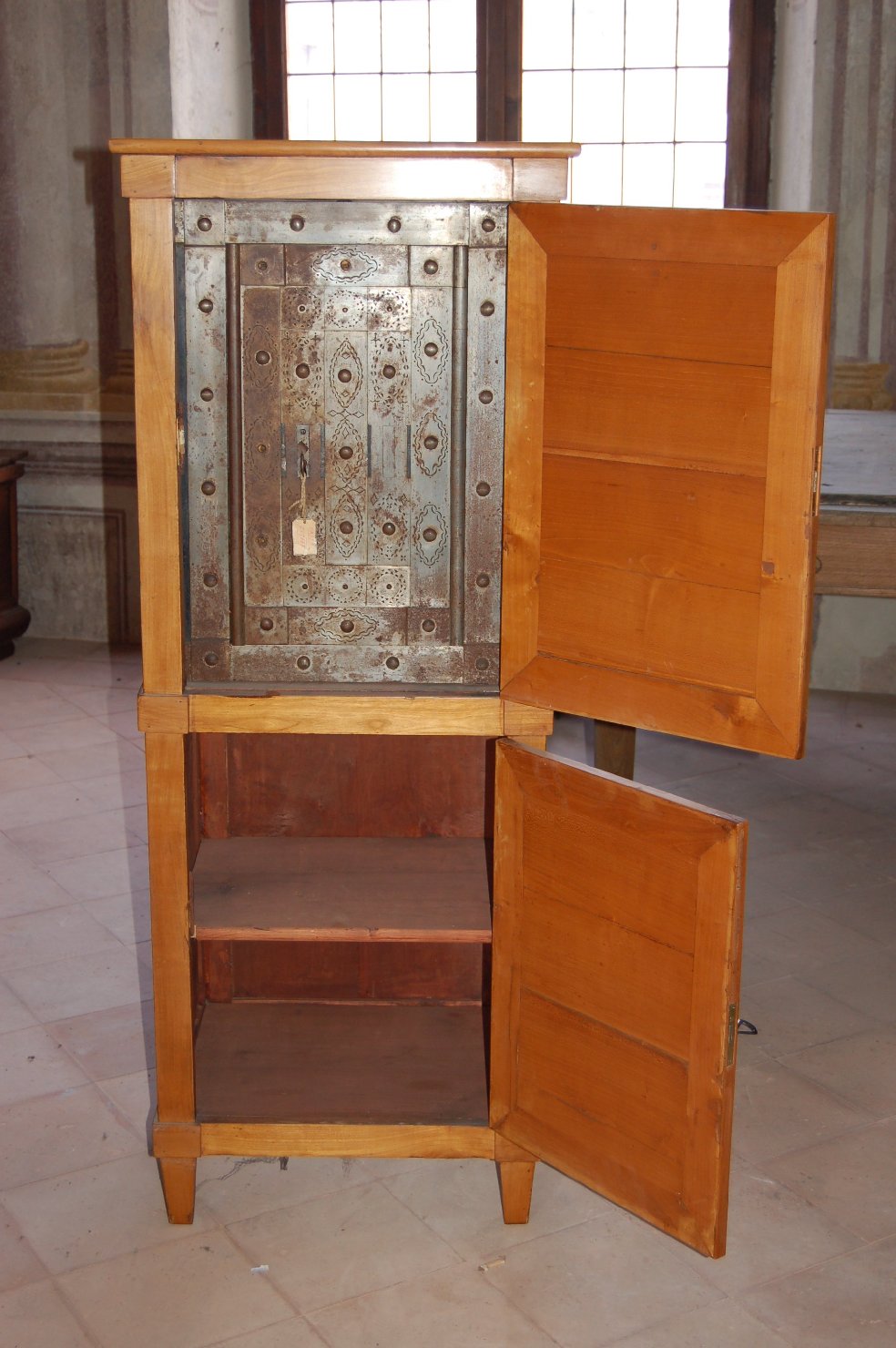 Cassaforte in ferro, rivestita da un'armadiatura in legno. Il mobile di ri vestimento è suddiviso in due parti di uguale altezza da una liscia corni c e marcapiano, leggermente aggettante, così come nella parte apicale supe ri ore e nella base inferiore. Sul fronte presenta due sportelli sovrappos ti, con serratura. Entrambi i lati sono definiti da liscie specchiature s ovr apposte. Il retro della parte alta è sprovvisto di schiena. Piedi tron co-p iramidali. Il corpo interno della cassaforte in ferro, con serrature origi nali, e decorato a cesello con motivi a losanghe e borchie è inserit o nel corpo superiore del mobile; la parte inferiore è costituita invece d a un v ano con ripiano centrale