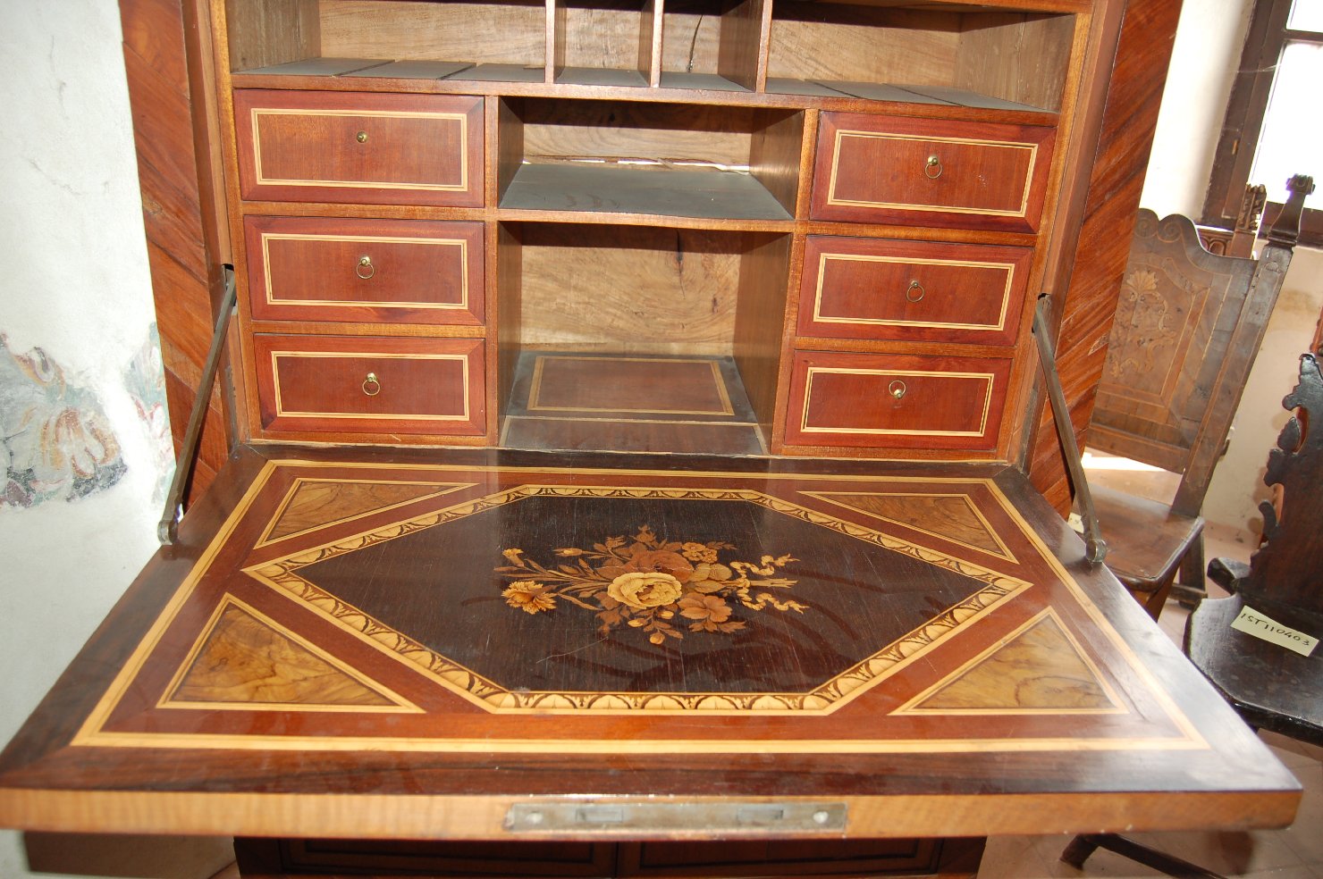 - NOTIZIE STORICO CRITICHE Lo stipo rispecchia fedelmente, nella generale conformazione e nei singoli elementi strutturali e decorativi, il modello del secrétaire à abattant c he si sviluppò in Francia e cominciò ad essere prodotto in larga scala a p artire dalla seconda metà del Settecento, secondo i canoni dello stile N eo classico. Anche in Italia, sopratutto nelle regioni settentrionali, que sto genere di mobile ebbe una particolare diffusione e sviluppo, tanto da ven ire largamente imitato anche nel tardo Ottocento e nei primi anni del Nove cento. I marchi ottocenteschi ritrovati sul fianco e nel retro dello stipo , inducono a ritenere che il mobile, pur oggetto di successivi resta uri e rifacimenti, possa risalire al XIX secolo