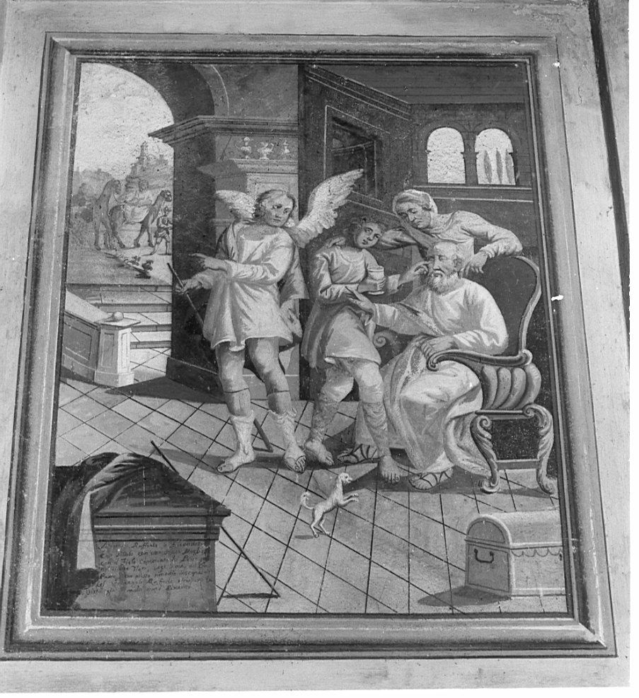- ISCRIZIONI in basso a sinistra - L'ARCANGELO RAFFAELE FU RICONDOTTO/ A CASA DI TOBIOLO E CON SUA MOGLIE/ CON IL FIELE CONSERVATO DEL PESCE/ PRESO NEL FIUME TIGRI UNGE GLI OCCHI DI SUO/ PADRE CON QUESTO RIMEDIO INSEGNATOLI/ DALL'ARCANGELO RAFFAELE RICUPERO' LA/ VISTA GIA' MOLTI (...) - corsivo - a pennello -