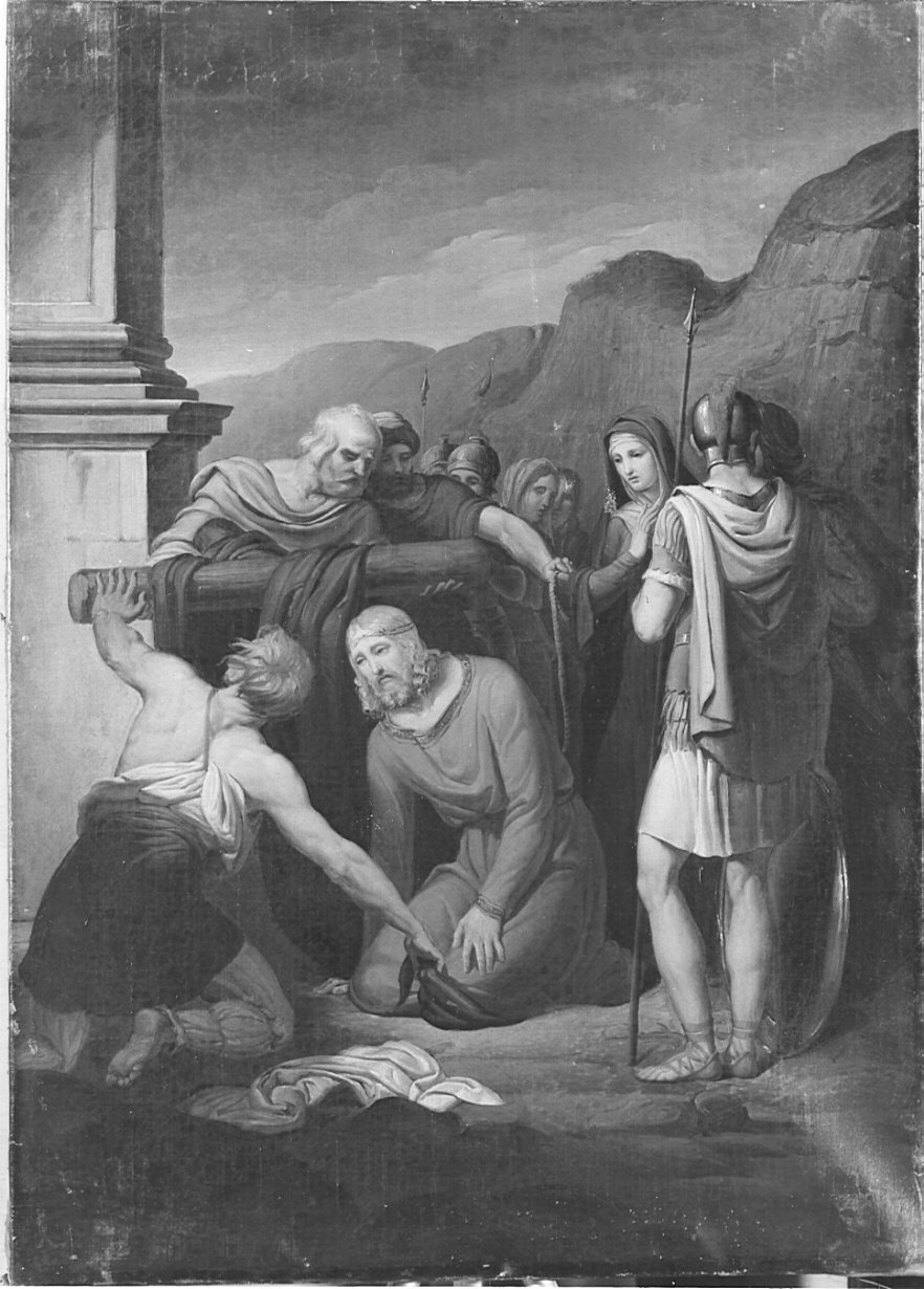 Personaggi: Cristo; Madonna. Figure femminili: pie donne; donne. Figure maschili: soldati. Oggetti: croce. Architetture: pilastro