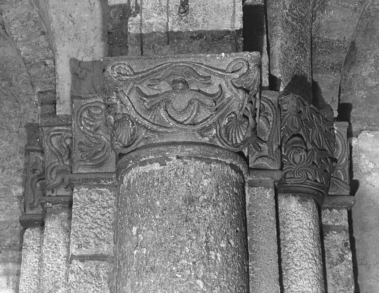 - NOTIZIE STORICO CRITICHE Tale capitello composito, dalla struttura assai complessa, adombra per lo più l'intervento degli scalpellini seicenteschi, impegnati nell' imitazione degli intrecci vegetali osservati sui capitelli romanici originali. Fa eccezione il capitello diagonale di nord-est, ove con molta probabilità è stato inserito un rifacimento ottocentesco ben riuscito, chiaramente in sostituzione di un pezzo seicentesco rovinato. Ciò fa ipotizzare il sospetto che operazioni simili siano state condotte altrove nell'atrio, mascherate ormai dalla spessa patina scura che ricopre i capitelli