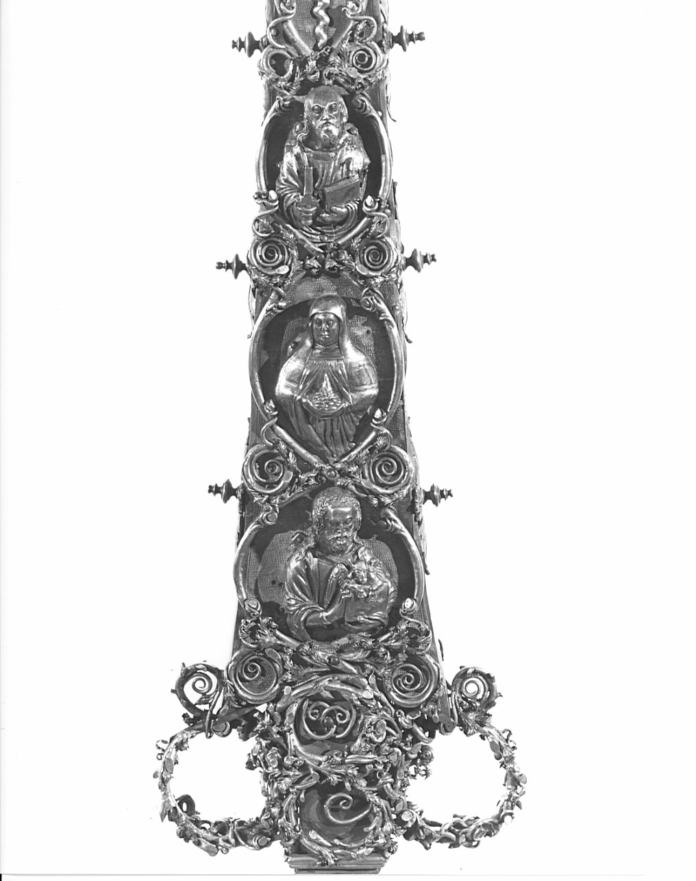 - NOTIZIE STORICO CRITICHE Le qualità stilistiche e formali, il materiale usato, la scelta delle decorazioni e della lavorazione, fanno ritenere la croce processionale, detta viscontea, realizzata alla fine del sec. XV da orefice lombardo. Sembra tuttavia molto strano che nel braccio superiore del recto sembra di poter riconoscere il ritratto di S.Carlo Borromeo. Forse la croce è stata restaurata nel sec. XVII apportandovi aggiunte, in sostituzioni di parti consunte. A conferma di questa ipotesi nell'Inventario del 1671 è annotato "ed è tutta compita non mancando cosa alcuna per essere stata di presente rinovata". Citata poi nell'Inventario del 1706 "quale opera di grande stima e valore" mentre nell'Inventario del 1748 è riportata la tradizione stilisticamente non accettabile: "la sopraccennata croce dicesi essere stata fatta con li denari che offerì in soma riguardevole circa l'anno 1124 monsignor vescovo d'Asti nonché si riconciliò con Anselmo della nobile famiglia Pusterla arcivescovo di Milano che lo riconobbe suo legittimo proprietario"
