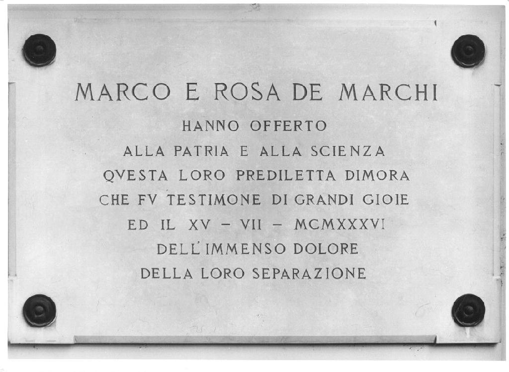 - ISCRIZIONI sulla lapide - Marco e Rosa de Marchi / hanno offerto / alla patria e alla scienza / questa loro prediletta dimora / che fu testimone di grandi gioie / ed il XV - II - MCMXXXVI / dell'immenso dolore / della loro separazione - lettere capitali - a solchi -